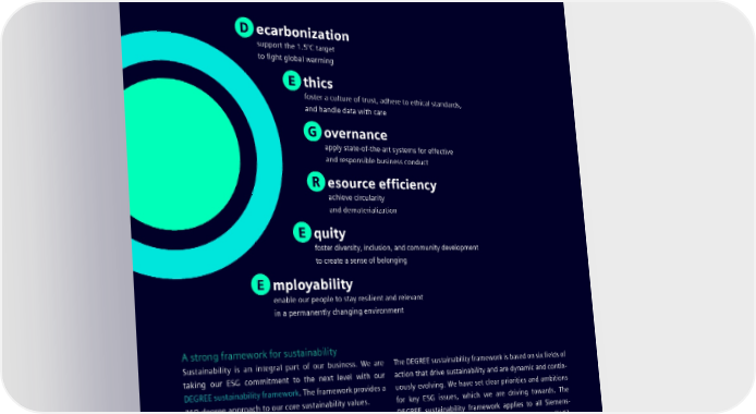 1.1 Our DEGREE sustainability framework sets clear and measurable ambitions 1.1 Our DEGREE sustainability framework sets measurable ambitions D ecarbonization support the 1.5°C target to fight global warming E thics foster a culture of trust, adhere to ethical standards, and handle data with care G overnance apply state-of-the-art systems for effective and responsible business conduct R esource efficiency achieve circularity and dematerialization E quity foster diversity, inclusion, and community development to create a sense of belonging E mployability enable our people to stay resilient and relevant in a permanently changing environment A strong framework for sustainability Sustainability is an integral part of our business. We are The DEGREE sustainability framework is based on six fields of taking our ESG commitment to the next level with our action that drive sustainability and are dynamic and contin- DEGREE sustainability framework. The framework provides a uously evolving. We have set clear priorities and ambitions 360-degree approach to our core sustainability values. for key ESG issues, which we are driving towards. The DEGREE sustainability framework applies to all Siemens- By addressing the three aspects of ESG, we are building a affiliated companies, excluding Siemens Healthineers (SHS). better future that helps us to However, the sustainability approach at SHS follows the same basic principles, which reflects our expectations as its →Stay within the planetary boundaries; majority shareholder. →Foster a culture of trust, empowerment, and growth; →Support inclusive economic opportunities; →Ensure that our people and businesses remain resilient and relevant for the future. SIEMENS SUSTAINABILITY REPORT 2023 8