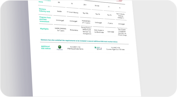 2.4 Sustainability ratings reflect our performance Siemens’ sustainability performance has received high recognition in external ratings External sustainability ratings Latest Siemens AA B- 28.4 81/100 77 A- score Siemens Top in industry st industry rank Leader 1 in our industry Top 15% Top 1% Top 1% (industry average C-) Progress from Improvement previous Unchanged Unchanged of 1.7 points Unchanged +7 points Unchanged assessment Strong “Carbon – Over 10 years Highlights Leader (AAA/AA) Prime status Products and Over 20 years in Gold medal at leadership for 7 years Services” risk the World Index level (A/A-) for management Climate Change Siemens has also satisfied the requirements to be included in several additional ESG stock market indices Additional Included in the Included in the ESG indices FTSE4Good Index Series Euronext Vigeo Euro 120 Index SIEMENS SUSTAINABILITY REPORT 2023 30