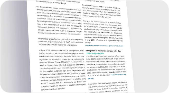 7.4 Task Force on ClimateRelated Financial Disclosures (TCFD) Furthermore, during this fiscal year, we conducted compre- We establish water targets at multiple sites to account for hensive global training sessions, featuring the participation the specific local environment and to drive effective mitiga- of qualified external specialists, aimed at strengthening our tion measures. At the corporate level, we have implemented business continuity management and standardizing our a defined water strategy, and have conducted risk assess- business impact analysis, particularly in the context of natural ments to shape local water targets. hazards. These initiatives also consider anticipated changes in risk exposures due to climate change. The aim of our water strategy is to minimize the adverse local effects of our water consumption and use. In fiscal Our decision-making process for selecting new locations and 2022, we expanded the analysis of our water-related risks to devising sustainable, long-term protective measures is based include our supply chain. Based on this analysis, we derived on an exhaustive risk analysis, with a particular emphasis on further measures for sustainable water use. natural hazards. This includes an in-depth examination and modeling of current risk factors and future climate scenarios, Our water risk analysis begins with an assessment of our facilitating the formulation of proactive measures. In addi- environmentally relevant sites using the Aqueduct Water tion to the assessment of physical risks, we engage in Risk Atlas from the World Resources Institute (WRI). With the transparent dialogues with partners to comprehensively aid of an internal analytical tool, Siemens assesses local-level evaluate transitional risks, such as regulatory changes, risks resulting from our sites’ activities, and then assesses thereby encompassing associated risks and opportunities. them in relation to regional water risks. Sites with a high-risk assessment need to define targets to reduce the level of risk. We employ a range of systems and meticulously compare the In fiscal 2023, 96% of our sites implemented this water parameters acquired from Swiss RE (RDS), Zurich Resilience strategy. Solutions (ZRS), Verizon Maplecroft, among others. CONSERVING RESOURCES, CDP 2023 C2, CDP 2023 WATER SECURITY In fiscal 2023, we conducted the Do No Significant Harm Management of climate risks along our value chain (DNSH) assessment with regards to future physical climate Climate change mitigation risks in the context of our reporting under the EU Taxonomy In addition to our Science-Based Target, we defined a target regulation for all activities related to the environmental in the DEGREE sustainability framework for our upstream objective “Climate Change Mitigation”. The assessment of Scope 3 emissions: Siemens without Siemens Healthineers physical climate-related risks of all eligible and substantially (SHS) has set a target to reduce CO e emissions generated in 2 contributing activities was conducted by technical experts our supply chain by 20% by 2030 compared to 2020. We also on site, supplier, and project type levels. We partnered with aim to achieve Net Zero emissions in our supply chain by insurers and other external risk data providers to assess 2050. Details on our upstream Scope 3 emissions in fiscal future hazards associated with climate change, e.g. cyclone, 2023 can be found in the chapter SUSTAINABLE SUPPLY CHAIN hurricane, typhoon, heavy precipitation, or wildfire, using PRACTICES. the IPCC scenario RCP 4.5. Additionally, we defined and - In our Carbon Reduction@Suppliers program, we collaborate started to implement measures at locations where signifi cant risks have been identified. with an external partner to analyze the economic data and model the carbon footprint of each of our suppliers. To Climate change is also having an impact on water supply. facilitate this process, we utilize a web-based tool called Water is one of humanity’s most important resources. For supplier+s that highlights the main sources of suppliers’ this reason, Siemens has been analyzing water scarcity, CO2e emissions and provides guidance on how to reduce water pollution, local fire risks, climate change, and flooding them. Once suppliers have completed the learning phase, and precipitation patterns at our sites for several years. We they provide us with their primary data through the tool. consider these analyses in our business decisions: for example, CONSERVING RESOURCES, SUSTAINABLE SUPPLY CHAIN PRACTICES when we select the location for a new site or implement precautionary measures. SIEMENS SUSTAINABILITY REPORT 2023 141