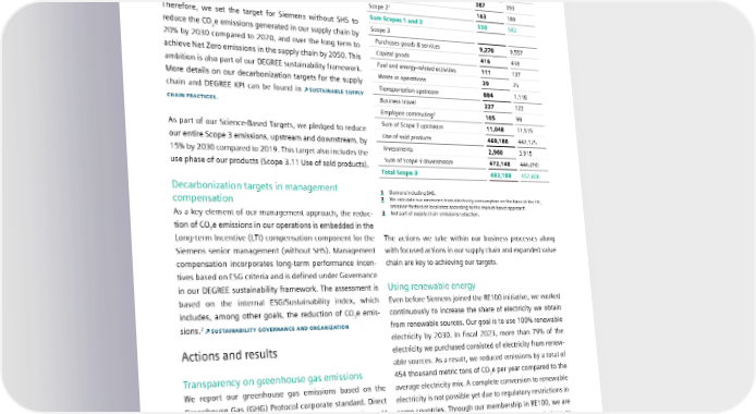 4.1 Climate action Decarbonization targets for our upstream and 1 downstream value chain Greenhouse gas emissions Regarding Scope 3 emissions, we are focused in particular Fiscal year (In 1,000 metric tons of CO equivalents) 2023 2022 on reducing emissions in our supply chain and in the use 2 phase of our products. Scope 1 387 393 Scope 22 163 189 Therefore, we set the target for Siemens without SHS to Sum Scopes 1 and 2 550 582 reduce the CO e emissions generated in our supply chain by Scope 3 2 Purchases goods & services 9,276 9,557 20% by 2030 compared to 2020, and over the long term to Capital goods 416 458 achieve Net Zero emissions in the supply chain by 2050. This Fuel and energy-related activities 111 137 ambition is also part of our DEGREE sustainability framework. Waste in operations 29 25 More details on our decarbonization targets for the supply Transportation upstream 884 1,118 chain and DEGREE KPI can be found in SUSTAINABLE SUPPLY Business travel 227 122 CHAIN PRACTICES. Employee commuting3 105 98 As part of our Science-Based Targets, we pledged to reduce Sum of Scope 3 upstream 11,048 11,515 our entire Scope 3 emissions, upstream and downstream, by Use of sold products 469,180 442,175 15% by 2030 compared to 2019. This target also includes the Investments 2,960 3,915 use phase of our products (Scope 3.11 Use of sold products). Sum of Scope 3 downstream 472,140 446,090 Total Scope 3 483,188 457,606 Decarbonization targets in management 1 Siemens including SHS. 2 We calculate our emissions from electricity consumption on the basis of the CO compensation emission factors of local sites according to the market-based approach. 2 As a key element of our management approach, the reduc- 3 Not part of supply chain emissions reduction. tion of CO e emissions in our operations is embedded in the 2 Long-term Incentive (LTI) compensation component for the The actions we take within our business processes along Siemens senior management (without SHS). Management with focused actions in our supply chain and expanded value - chain are key to achieving our targets. compensation incorporates long-term performance incen tives based on ESG criteria and is defined under Governance in our DEGREE sustainability framework. The assessment is Using renewable energy based on the internal ESG/Sustainability index, which Even before Siemens joined the RE100 initiative, we worked includes, among other goals, the reduction of CO e emis- continuously to increase the share of electricity we obtain 2 sions.2 SUSTAINABILITY GOVERNANCE AND ORGANIZATION from renewable sources. Our goal is to use 100% renewable electricity by 2030. In fiscal 2023, more than 79% of the Actions and results electricity we purchased consisted of electricity from renew- able sources. As a result, we reduced emissions by a total of Transparency on greenhouse gas emissions 454 thousand metric tons of CO e per year compared to the 2 We report our greenhouse gas emissions based on the average electricity mix. A complete conversion to renewable Greenhouse Gas (GHG) Protocol corporate standard. Direct electricity is not possible yet due to regulatory restrictions in greenhouse gas emissions from our own operations (Scope 1) some countries. Through our membership in RE100, we are and indirect emissions from purchased electricity and district working toward the amendment of these regulations to heating (Scope 2) are calculated for all sites. We also report make complete conversion a reality. In purchasing renewable our emissions in our upstream and downstream value chain (Scope 3), including emissions originating in our supply chains and the use of our products. 2 Assessment based on the Siemens internal ESG/sustainability index, which is based on customer satisfaction (Net Promoter Score), CO reduction, and digital learning hours. 2 SIEMENS SUSTAINABILITY REPORT 2023 60