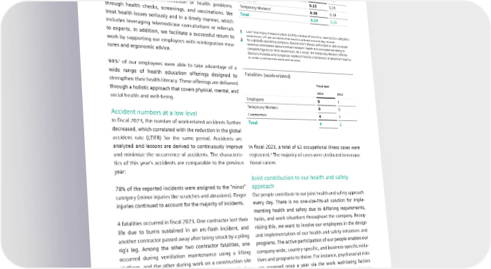 5.4 Occupational health and safety management Continuous expansion of health services We are continuously expanding our spectrum of health ser- LTIFR Employees and Temporary Workers¹ vices to support the resilience and health of our people at Fiscal year work and beyond. In fiscal 2023, 99%1 of our employees 2023 2022 have access to company medical care. This includes the Employees 0.23 0.25 prevention and early identification of health problems Temporary Workers² 0.30 0.38 through health checks, screenings, and vaccinations. We Total 0.24 0.26 treat health issues seriously and in a timely manner, which includes leveraging telemedicine consultations or referrals 1 Lost Time Injury Frequency Rate (LTIFR): number of lost-time cases (LTC) × 200,000 / to experts. In addition, we facilitate a successful return to work hours; LTC are accidents that result in at least one lost day of work. 2 As a globally operating company, Siemens isn’t always authorized or able to obtain work by supporting our employees with reintegration mea- sensitive information about contract workers‘ health and occupational safety or complete figures on their work hours. As a result, the Temporary Worker LTIFR for sures and ergonomic advice. Siemens includes only temporary workers hired by a temporary employment agency or under a contract for work and services. 1 94% of our employees were able to take advantage of a wide range of health education offerings designed to Fatalities (work-related) strengthen their health literacy. These offerings are delivered Fiscal year through a holistic approach that covers physical, mental, and 2023 2022 social health and well-being. Employees 0 1 Temporary Workers 0 0 Accident numbers at a low level Contractors 4 1 In fiscal 2023, the number of work-related accidents further Total 4 2 decreased, which correlated with the reduction in the global accident rate (LTIFR) for the same period. Accidents are analyzed and lessons are derived to continuously improve In fiscal 2023, a total of 62 occupational illness cases were and minimize the occurrence of accidents. The characteris- registered.2 The majority of cases were attributed to occupa- tics of this year’s accidents are comparable to the previous tional cancer. year: Joint contribution to our health and safety 78% of the reported incidents were assigned to the “minor” approach category (minor injuries like scratches and abrasions). Finger Our people contribute to our joint health and safety approach injuries continued to account for the majority of incidents. every day. There is no one-size-fits-all solution for imple- menting health and safety due to differing requirements, 4 fatalities occurred in fiscal 2023. One contractor lost their tasks, and work situations throughout the company. Recog- life due to burns sustained in an arc-flash incident, and nizing this, we want to involve our employees in the design another contractor passed away after being struck by a piling and implementation of our health and safety initiatives and rig’s leg. Among the other two contractor fatalities, one programs. The active participation of our people enables our occurred during ventilation maintenance using a lifting company-wide, country-specific, and business-specific initia- platform, and the other during work on a construction site tives and programs to thrive. For instance, psychosocial risks while using a mobile scaffold. Each incident and fatality is a are assessed once a year via the work well-being factors source of grief for the people concerned as well as their embedded in the Siemens Global Engagement Survey families, friends, and colleagues. Each incident is a renewed (SGES)1. The relevant teams then discuss and document the call for us to keep improving and ensuring a safe and healthy risks, opportunities, and measures, and outcomes in a struc- work environment for our people and partners. tured follow-up process. 1 Siemens without SHS. 2 Excluding temporary workers and contractors. SIEMENS SUSTAINABILITY REPORT 2023 101