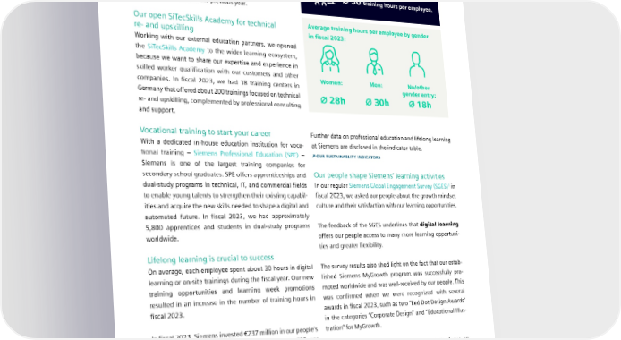 5.3 Professional education and lifelong learning Siemens AG in Germany allocated a total of €100 million for Average training hours per employee the Future Fund that will be invested over a period of four fiscal years starting in January 2019. The term of the Future Fund has now been extended to 2026. More than €3 million ∅ 30 training hours per employee. were approved for Future Fund projects in fiscal 2023, about €11 million less than in the previous year. Our open SiTecSkills Academy for technical Average training hours per employee by gender re- and upskilling in fiscal 2023: Working with our external education partners, we opened the SiTecSkills Academy to the wider learning ecosystem, because we want to share our expertise and experience in skilled worker qualification with our customers and other Women: Men: No/other companies. In fiscal 2023, we had 18 training centers in gender entry: Germany that offered about 200 trainings focused on technical ∅ 28h ∅ 30h ∅ 18h re- and upskilling, complemented by professional consulting and support. Vocational training to start your career Further data on professional education and lifelong learning With a dedicated in-house education institution for voca- at Siemens are disclosed in the indicator table. tional training – Siemens Professional Education (SPE) – OUR SUSTAINABLITY INDICATORS Siemens is one of the largest training companies for secondary school graduates. SPE offers apprenticeships and Our people shape Siemens’ learning activities dual-study programs in technical, IT, and commercial fields In our regular Siemens Global Engagement Survey (SGES)1 in to enable young talents to strengthen their existing capabil- fiscal 2023, we asked our people about the growth mindset ities and acquire the new skills needed to shape a digital and culture and their satisfaction with our learning opportunities. automated future. In fiscal 2023, we had approximately 5,800 apprentices and students in dual-study programs The feedback of the SGES underlines that digital learning worldwide. offers our people access to many more learning opportuni- ties and greater flexibility. Lifelong learning is crucial to success On average, each employee spent about 30 hours in digital The survey results also shed light on the fact that our estab- learning or on-site trainings during the fiscal year. Our new lished Siemens MyGrowth program was successfully pro- training opportunities and learning week promotions moted worldwide and was well-received by our people. This resulted in an increase in the number of training hours in was confirmed when we were recognized with several fiscal 2023. awards in fiscal 2023, such as two “Red Dot Design Awards” in the categories “Corporate Design” and “Educational Illus- In fiscal 2023, Siemens invested €237 million in our people’s tration” for MyGrowth. training, which corresponds to an average of €753 per employee. In total, we invested approximately €416 million We will continue to use the survey results to focus on in employee education and training. strategic learning and continuously shaping our portfolio of futureoriented learning opportunities. 1 Siemens without SHS. SIEMENS SUSTAINABILITY REPORT 2023 96