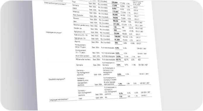 6 Our sustainability indicators Sustainability Key Performance Indicators Fiscal Year/ (KPIs) September 30th Unit FY 2023 FY 2022 +/– Standards SOCIAL 15 Working for Siemens GRI 2-7, SASB Siemens employees16 Total Sept. 30th No. (rounded) 320,000 311,000 2.9% RT-EE_000B Other internal workforce17 Total Sept. 30th No. (rounded) 17,200 16,900 1.8% GRI 2-7 External/third party workers18 Germany Sept. 30th No. (rounded) 4,400 4,400 0.0% GRI 2-8 EMEA Sept. 30th No. (rounded) 175,000 172,000 1.7% GRI 2-7 Americas Sept. 30th No. (rounded) 66,000 64,000 3.1% GRI 2-7 Asia, Australia Sept. 30th No. (rounded) 78,000 75,000 4.0% GRI 2-7 Women Sept. 30th No. (rounded) 88,000 84,000 4.8% GRI 2-7, WEF Men Sept. 30th No. (rounded) 231,000 225,000 2.7% GRI 2-7, WEF No/other gender entry Sept. 30th No. (rounded) 140 180 –22.2% GRI 2-7, WEF Gender n/a Sept. 30th No. (rounded) 900 1,600 –43.8% GRI 2-7, WEF Age group < 30 Sept. 30th No. (rounded) 50,000 48,000 4.2% GRI 2-7 Employee structure19 Age group 30 – 50 Sept. 30th No. (rounded) 188,000 182,000 3.3% GRI 2-7 Age group > 50 Sept. 30th No. (rounded) 81,000 79,000 2.5% GRI 2-7 Age n/a Sept. 30th No. (rounded) 900 1,600 −43.8% GRI 2-7 Young workers below 15 years Sept. 30th % of total employees 0.0% 0.0% GRI 405-1, WEF Young workers 15 – 17 years Sept. 30th % of total employees 0.0% 0.0% GRI 405-1, WEF Blue-collar workers Sept. 30th % of total employees 16.9% 17.3% –2.3% WEF White-collar workers Sept. 30th % of total employees 83.1% 82.7% 0.5% WEF % of employees in Germany Sept. 30th Germany 5.6% 5.7% –1.8% GRI 405-1, WEF % of employees in Germany – Germany in top Top management management positions Sept. 30th positions 0.0% 0.0% GRI 405-1, WEF Disabled employees20 Germany – % of employees in Middle & junior Germany in middle management & junior manage- positions Sept. 30th ment positions 1.9% 1.8% 5.6% GRI 405-1, WEF % of employees in Germany – Germany in Non- management non-management positions Sept. 30th positions 5.3% 5.5% –3.6% GRI 405-1, WEF Employee nationalities21 Total Sept. 30th No. 170 168 1.2% GRI 405-1 15 All employee data in this section are based on headcount. 16 Employee refers to every natural person in an active employment relationship with a fully consolidated Siemens company. Employees are all internal workforce without apprentices, students, interns and other internal workforce. 17 Other internal workforce/non-employees according to our financial reporting guidelines (e.g. apprentices, students, interns and other internal workforce). 18 External/third party workers who work in our workforce/contingent workers. 19 Employee structure data are only for employees, without other internal workforce and without external/third party workers. 20 Severely Handicapped Employees-rate (SHE) is based on legally defined guidelines and specifications according §§ 154-1+3 SGB IX (German Social Law). 21 Employees, without other internal workforce and without external workforce. SIEMENS SUSTAINABILITY REPORT 2023 115