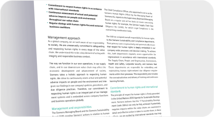 3.2 Human rights 3.2 Human rights – Commitment to respect human rights in accordance The Chief Compliance Officer, also appointed to serve as the with international standards Siemens Human Rights Officer by the Managing Board of – Continuous assessment of actual and potential Siemens AG, reports to the Supervisory Board and Managing adverse impacts on people and environment Board on a regular and ad hoc basis on issues concerning throughout our value chain human rights: for example, the German Supply Chain Due – Regular dialogs with human rightsfocused external Diligence Act (LkSG), for which Legal Compliance is the business coalitions overarching coordination body. The SSB has assigned overall responsibility for human rights Management approach to the Siemens Sustainability and Compliance departments. As a global company, we are well aware of our responsibility Their primary task is to proactively and systematically ensure to society. We are unreservedly committed to safeguarding that respect for human rights is deeply embedded in our and respecting human rights in every stage of the value company-wide processes and decision-making. To achieve chain. We understand this to be a key element of acting with this, both departments regularly assess opportunities for integrity and responsible business conduct. improvement in accordance with international standards. The Supply Chain, People and Organization, Environment, The way we function in our own operations, in our supply Health and Safety, Corporate Security, and Siemens Real chain, and in our downstream value chain may affect the Estate departments are responsible for embedding and economic development and advancement of society. maintaining human rights-related due diligence require- Siemens takes a holistic approach to respecting human ments within their processes. This responsibility also includes rights. We strive to continuously assess actual and potential the conceptualization and delivery of training and continuous adverse impacts on people and the environment and inte- learning formats. grate our findings in our company’s policies, procedures, and due diligence practices. Therefore, our commitment to Commitment to human rights and international respecting human rights is an integral part of our manage- standards ment systems and is embedded across company functions The principle of respect for human rights is firmly grounded and business operations globally. in the United Nations 2030 Agenda for Sustainable Develop- ment. Siemens believes that the 17 Sustainability Develop- Management and responsibilities ment Goals (SDGs) can only be fully achieved if potentially The Siemens Managing Board and the Siemens Sustainability negative impacts within the value chains are examined in Board (SSB) monitor Siemens’ actions in relation to human detail and effective action is taken to counter them. In these rights and our commitment to implementing the United efforts, we are guided by international standards that help Nations Guiding Principles on Business and Human Rights. companies define their approaches to human rights and These bodies review our progress and our challenges and continuously optimize them. These standards include the identify opportunities for improvement. United Nations Guiding Principles on Business and Human Rights and the Guidelines for Multinational Enterprises published by the Organization for Economic Cooperation and Development (OECD). They highlight the importance of due diligence systems that proactively identify, assess, and mitigate potential adverse human rights impacts. SIEMENS SUSTAINABILITY REPORT 2023 40