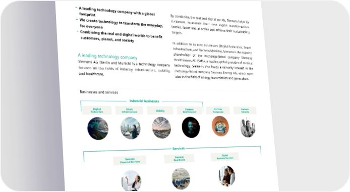 1.2 Company profile 1.2 Company profile – A leading technology company with a global By combining the real and digital worlds, Siemens helps its footprint customers accelerate their own digital transformations – We create technology to transform the everyday, (easier, faster and at scale) and achieve their sustainability for everyone targets. – Combining the real and digital worlds to benefit customers, planet, and society In addition to its core businesses (Digital Industries, Smart Infrastructure, and Siemens Mobility), Siemens is the majority shareholder of the exchange-listed company Siemens A leading technology company Healthineers AG (SHS), a leading global provider of medical Siemens AG (Berlin and Munich) is a technology company technology. Siemens also holds a minority interest in the focused on the fields of industry, infrastructure, mobility, exchange-listed company Siemens Energy AG, which oper- and healthcare. ates in the field of energy transmission and generation. Businesses and services Industrial businesses Digital Smart Mobility Siemens Portfolio Siemens Industries Infrastructure Healthineers1 Companies Advanta Services Siemens Siemens Global Financial Services Real Estate Business Services 1 Publicly listed subsidiary of Siemens; Siemens’ share in Siemens Healthineers is 75%. SIEMENS SUSTAINABILITY REPORT 2023 10