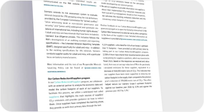 3.3 Sustainable supply chain practices supply chain that are associated with the production of tin, Supplier+s is based on the following methodology: tantalum, tungsten, and gold (3TG). We share our findings on identified smelters with our RMI partners. The initiative → Suppliers are categorized into product or service categories then reviews the smelters’ certification. In this process, and country of origin and are then assigned an industry Siemens supports the smelters as they move toward the final average for CO2e emissions based on the calculation audit and certification stage. Individual results are model developed by our external partner. communicated on the RMI website WWW.RESPONSIBLE → We ask our suppliers to provide information via supplier+s MINERALSINITIATIVE.ORG. about their implemented CO e reduction measures and 2 their overall CO2e management. Based on their responses, Siemens extends its risk assessment system to evaluate we calculate the resulting emissions reduction and the minerals beyond the 3TG grouping using the risk definitions remaining carbon footprint of the supplier. provided by the European Commission for “armed conflict,” “areas witnessing weak or non-existent governance and Positive feedback on our Carbon Reduction@Suppliers pro- security,” and “[areas with] widespread and systematic vio- gram encouraged us to open the formerly internal tool (CWA lations of international law, including human rights abuses.” Carbon Web Assessment) to external use by other companies Cobalt and mica are two minerals that have been included in in the form of the supplier+s tool. Detailed information on Siemens’ due diligence process. This inclusion follows the supplier+s is provided at WWW.SIEMENS.COM/CARBONSUPPLIERS. RMI’s development of an auditing standard and reporting specifications – the Extended Minerals Reporting Template 4,324 suppliers – who stand for 43% of our Scope 3 upstream (EMRT), designed specifically for cobalt and mica – in addition (tier 1) footprint – have provided us with primary data by to the existing specifications for 3TG minerals. Siemens taking part in our Carbon Reduction@Suppliers program. conducts supplier audits for cobalt and mica, with a particular 2,038 of them have shared their decarbonization plans with focus on battery manufacturers. us by joining the supplier+s platform, which was launched in fiscal 2023. Based on the responses we received and calcu- More information and the text of our Responsible Minerals lated, there was an average reduction of 9% in the previously Sourcing Policy can be found at WWW.SIEMENS.COM/ calculated emissions for these suppliers, equivalent to a RESPONSIBLEMINERALS. decrease of 464,000 metric tons of CO2e. This indicates that our suppliers have been more supportive in reducing our Our Carbon Reduction@Suppliers program carbon footprint in the supply chain compared to the previous In our Carbon Reduction@Suppliers program, we collaborate year’s reduction of 359,000 metric tons of CO e. This effort 2 with an external partner to analyze the economic data and helped reduce our Siemens Scope 3 upstream footprint model the carbon footprint of each of our suppliers. To against our baseline year 2020 by 0.9% and against the 1 facilitate this process, we utilize a web-based tool called previous year 2022 by 3.3%. supplier+s that highlights the main sources of suppliers’ CO2e emissions and provides guidance on how to reduce them. Once suppliers have completed the learning phase, they provide us with their primary data through the tool. 1 Siemens without SHS SIEMENS SUSTAINABILITY REPORT 2023 48