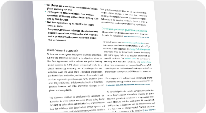 4.1 Climate action 4.1 Climate action – Our pledge: We are making a contribution to limiting With global temperatures rising, we are committed to help global warming to 1.5°C mitigate climate change. At the same time, Siemens is – Our targets: To reduce emissions from business assessing climate-related risks and opportunities and poten- operations at Siemens without SHS by 55% by 2025 tial measures for adapting to climate change in order to and by 90% by 2030 ensure business continuity and functioning supply chains. – Net Zero operations by 2030 and in our supply chain by 2050 Our climate-protection governance and policies – Our path: Continuous reduction of emissions from Climate-related issues are managed as part of our environmen- business operations, collaboration with suppliers, tal protection management. HOLISTIC ENVIRONMENTAL PROTECTION and a portfolio that helps our customers protect the environment For climate protection, the Environmental Protection depart- ment supports our businesses in their efforts to reduce CO2e emissions in their operations. The Supply Chain Management Management approach department helps our business units promote decarboniza- At Siemens, we recognize the urgency of climate protection. tion in the supply chain at our suppliers and through our It is our top priority to contribute to the objectives set out in material purchases. Our business units are responsible for the Paris Agreement, which includes the goal of limiting reducing their respective emissions. The Sustainability global warming to 1.5°C above preindustrial levels. As a department is responsible for the consolidated Siemens GHG global technology company, we acknowledge that our reporting and our Net Zero Operations Program and defines activities along the value chain – including procurement, the necessary management and GHG reporting approaches. product design, production, and the use of our products and services – generate greenhouse gas (GHG) emissions (here- For our approach to and governance for managing climate- after CO2e emissions). This is contributing to a global tem- related risks and opportunities, please see our reporting on perature increase and other irreversible changes to our TASK FORCE ON CLIMATERELATED FINANCIAL DISCLOSURES (TCFD). planet and ecosystems. We have pledged to aim to make an important contribution The Siemens portfolio is simultaneously supporting the to the decarbonization of the global economy. We aim to transition to a low-carbon economy. We are doing this by reach this goal with the assistance of an appropriate gover- focusing on automation and digitalization, smart infrastruc- nance structure, including strategy and risk management, ture for buildings with decentralized energy systems and and by acting in accordance with the recommendations of charging solutions, and intelligent transportation solutions. the Task Force on Climate-Related Financial Disclosures For instance, our energy-efficient products and solutions can (TCFD). Our commitment to the initiatives RE100 (COMPLETE support the transition from fossil fuels to renewable energy CONVERSION TO RENEWABLE ELECTRICITY), EV100 (CONVERSION OF THE sources, and our electrification solutions enable renewable VEHICLE FLEET TO ELECTRIC VEHICLES), and EP100 (NET ZERO EMISSION grid integration and the electrification of heat and hydrogen. BUILDINGS) further supports us in our efforts to achieve our This also creates more business opportunities for Siemens. decarbonization targets. SIEMENS SUSTAINABILITY REPORT 2023 58
