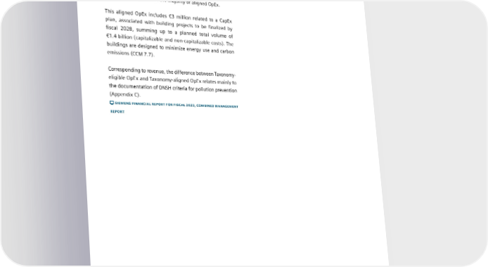 4.4 EU taxonomy The majority of eligible and/or aligned expenditures relate to processes and assets associated with the economic activities described for the revenue KPI: (i) Manufacture of low-carbon technologies for transport (CCM 3.3) and (ii) rail transportation infrastructure (CCM 6.14). These two activities account for half of eligible OpEx and the majority of aligned OpEx. This aligned OpEx includes €3 million related to a CapEx plan, associated with building projects to be finalized by fiscal 2028, summing up to a planned total volume of €1.4 billion (capitalizable and non-capitalizable costs). The buildings are designed to minimize energy use and carbon emissions (CCM 7.7). Corresponding to revenue, the difference between Taxonomy- eligible OpEx and Taxonomy-aligned OpEx relates mainly to the documentation of DNSH criteria for pollution prevention (Appendix C). SIEMENS FINANCIAL REPORT FOR FISCAL 2023, COMBINED MANAGEMENT REPORT SIEMENS SUSTAINABILITY REPORT 2023 80