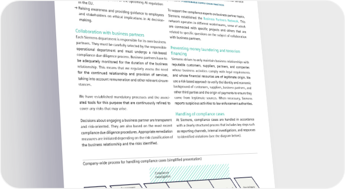 3.1 Compliance and ethics Our commitment to ethical standards is demonstrated by Both business partners and suppliers are required to sign a integrating AI ethics into all our business processes, products, code of conduct. In addition, depending on their risk classi- and solutions. This includes: fication, audits can be conducted on the business partners’ premises by the Siemens audit function or external service → Applying generally accepted and trustworthy AI frameworks providers. SUSTAINABLE SUPPLY CHAIN PRACTICES to AI tools in anticipation of the upcoming AI regulation in the EU. To support the compliance experts on business partner topics, → Raising awareness and providing guidance to employees Siemens established the Business Partners Network. This and stakeholders on ethical implications in AI decision- network operates in different workstreams, some of which making. are connected with specific projects and others that are related to specific questions on the subject of collaboration Collaboration with business partners with business partners. Each Siemens department is responsible for its own business partners. They must be carefully selected by the responsible Preventing money laundering and terrorism operational department and must undergo a risk-based financing compliance due diligence process. Business partners have to Siemens strives to only maintain business relationships with be adequately monitored for the duration of the business reputable customers, suppliers, partners, and companies relationship. This means that we regularly assess the need whose business activities comply with legal requirements for the continued relationship and provision of services, and whose financial resources are of legitimate origin. We taking into account remuneration and other relevant circum- use a risk-based approach to verify the identity and economic stances. background of customers, suppliers, business partners, and other third parties and the origin of payments to ensure they We have established mandatory processes and the associ- come from legitimate sources. When necessary, Siemens ated tools for this purpose that are continuously refined to reports suspicious activities to law enforcement authorities. cover any risks that may arise. Handling of compliance cases Decisions about engaging a business partner are transparent At Siemens, compliance cases are handled in accordance and risk-oriented. They are also based on the most recent with a clearly structured process that includes key steps such compliance due diligence procedures. Appropriate remediation as reporting channels, internal investigations, and responses measures are initiated depending on the risk classification of to identified violations (see the diagram below). the business relationship and the risks identified. Company-wide process for handling compliance cases (simplified presentation) Compliance investigation Assessment carried out by examining or Research Preparation of Disciplinary Allegation received evaluating the Mandating and planning Investigation the investigation measures and allegation before report remediation mandating an investigation SIEMENS SUSTAINABILITY REPORT 2023 35