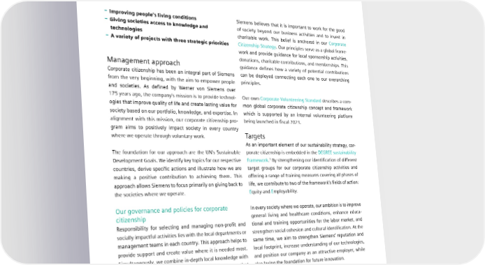 5.5 Corporate citizenship 5.5 Corporate citizenship – Improving people’s living conditions Siemens believes that it is important to work for the good – Giving societies access to knowledge and of society beyond our business activities and to invest in technologies charitable work. This belief is anchored in our Corporate – A variety of projects with three strategic priorities Citizenship Strategy. Our principles serve as a global frame- work and provide guidance for local sponsorship activities, donations, charitable contributions, and memberships. This Management approach guidance defines how a variety of potential contributions Corporate citizenship has been an integral part of Siemens can be deployed connecting each one to our overarching from the very beginning, with the aim to empower people principles. and societies. As defined by Werner von Siemens over 175 years ago, the company’s mission is to provide technol- Our own Corporate Volunteering Standard describes a com- ogies that improve quality of life and create lasting value for mon global corporate citizenship concept and framework society based on our portfolio, knowledge, and expertise. In which is supported by an internal volunteering platform alignment with this mission, our corporate citizenship pro- being launched in fiscal 2023. gram aims to positively impact society in every country where we operate through voluntary work. Targets As an important element of our sustainability strategy, cor- The foundation for our approach are the UN’s Sustainable porate citizenship is embedded in the DEGREE sustainability Development Goals. We identify key topics for our respective framework.1 By strengthening our identification of different countries, derive specific actions and illustrate how we are target groups for our corporate citizenship activities and making a positive contribution to achieving them. This offering a range of training measures covering all phases of approach allows Siemens to focus primarily on giving back to life, we contribute to two of the framework’s fields of action: the societies where we operate. Equity and Employability. Our governance and policies for corporate In every society where we operate, our ambition is to improve citizenship general living and healthcare conditions, enhance educa- Responsibility for selecting and managing non-profit and tional and training opportunities for the labor market, and socially impactful activities lies with the local departments or strengthen social cohesion and cultural identification. At the management teams in each country. This approach helps to same time, we aim to strengthen Siemens’ reputation and provide support and create value where it is needed most. local footprint, increase understanding of our technologies, Simultaneously, we combine in-depth local knowledge with and position our company as an attractive employer, while long-term commitment to overcome social challenges that also laying the foundation for future innovation. vary from region to region. Along with six other international Siemens foundations and Siemens Caring Hands e.V., the Siemens Stiftung comple- ments our corporate citizenship initiatives. WWW.SIEMENSSTIFTUNG.ORG/EN 1 Siemens without SHS. SIEMENS SUSTAINABILITY REPORT 2023 102