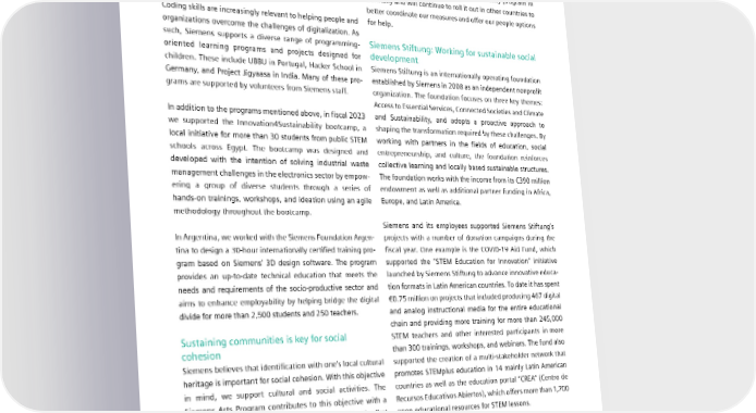 5.5 Corporate citizenship The promotion of education can take different forms and We are continuously striving to improve our impact on social pursue different objectives: However, the primary objective cohesion. A major challenge in recent years included unfore- remains consistent. We aim to provide enhanced equal seen events like the global pandemic and the war in Ukraine. access to future opportunities, and to give young people the To help those affected, we launched a charity program in tools to master future challenges. Germany and will continue to roll it out in other countries to better coordinate our measures and offer our people options Coding skills are increasingly relevant to helping people and for help. organizations overcome the challenges of digitalization. As such, Siemens supports a diverse range of programming- Siemens Stiftung: Working for sustainable social oriented learning programs and projects designed for development children. These include UBBU in Portugal, Hacker School in Siemens Stiftung is an internationally operating foundation Germany, and Project Jigyaasa in India. Many of these pro- established by Siemens in 2008 as an independent nonprofit grams are supported by volunteers from Siemens staff. organization. The foundation focuses on three key themes: Access to Essential Services, Connected Societies and Climate In addition to the programs mentioned above, in fiscal 2023 and Sustainability, and adopts a proactive approach to we supported the Innovation4Sustainability bootcamp, a shaping the transformation required by these challenges. By local initiative for more than 30 students from public STEM working with partners in the fields of education, social schools across Egypt. The bootcamp was designed and entrepreneurship, and culture, the foundation reinforces developed with the intention of solving industrial waste collective learning and locally based sustainable structures. management challenges in the electronics sector by empow- The foundation works with the income from its €390 million ering a group of diverse students through a series of endowment as well as additional partner funding in Africa, hands-on trainings, workshops, and ideation using an agile Europe, and Latin America. methodology throughout the bootcamp. Siemens and its employees supported Siemens Stiftung’s In Argentina, we worked with the Siemens Foundation Argen- projects with a number of donation campaigns during the tina to design a 30-hour internationally certified training pro- fiscal year. One example is the COVID-19 Aid Fund, which gram based on Siemens’ 3D design software. The program supported the “STEM Education for Innovation” initiative provides an up-to-date technical education that meets the launched by Siemens Stiftung to advance innovative educa- needs and requirements of the socio-productive sector and tion formats in Latin American countries. To date it has spent aims to enhance employability by helping bridge the digital €0.75 million on projects that included producing 467 digital divide for more than 2,500 students and 250 teachers. and analog instructional media for the entire educational chain and providing more training for more than 245,000 Sustaining communities is key for social STEM teachers and other interested participants in more cohesion than 300 trainings, workshops, and webinars. The fund also Siemens believes that identification with one’s local cultural supported the creation of a multi-stakeholder network that heritage is important for social cohesion. With this objective promotes STEMplus education in 14 mainly Latin American in mind, we support cultural and social activities. The countries as well as the education portal “CREA” (Centro de Siemens Arts Program contributes to this objective with a Recursos Educativos Abiertos), which offers more than 1,700 diverse range of projects: for example, support for the first open educational resources for STEM lessons. Namibian opera designed to promote intercultural under- standing. In addition, we help local communities create safe and stable environments. For instance, in fiscal 2023, we provided accommodations at our company premises in Warsaw to Ukrainian refugees. SIEMENS SUSTAINABILITY REPORT 2023 104