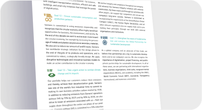 7.3 Our contribution to sustainable development of societies Goal 11 – Make cities and human settlements Goal 16 – Promote peaceful and inclusive societ- inclusive, safe, resilient, and sustainable ies for sustainable development, provide access to justice for all, and build effective, accountable, Siemens is a trusted partner for municipal governments and and inclusive institutions at all levels offers solutions across all infrastructure domains to make cities more efficient, sustainable, and resilient – for instance, We anchor integrity and compliance throughout our company with intelligent transportation solutions, efficient and safe and advance the Siemens Integrity Initiative with external buildings, and smart-city initiatives that leverage the power stakeholders. By these means and through our activities with of digitalization. other players, we support fair competition and ensure our company’s long-term success. Siemens is committed to Goal 12 – Ensure sustainable consumption and incorporating the requirements of the United Nations Global production patterns Compact (UNGC), the Human Rights Declaration, and all other relevant regulations into our supply chain and to pro- Siemens is committed to using resources responsibly and moting their principles through our work with external recognizes that the circular economy offers highly beneficial organizations and institutions. opportunities for business, the environment, and society. By the end of this decade we want to evolve even more toward Goal 17 – Strengthen the means of implementa- the circular economy, for example by increasing the percent- tion and revitalize the Global Partnership for age of metals and plastics we procure as secondary materials. Sustainable Development We also aim to reduce our amount of landfill waste. Siemens has worldwide strategic initiatives for the design phase to As a global company and an advocate of free trade, we - the end of lifecycle of its products and operations, and is believe that partnerships are a key to sustainable develop committed to robust, ecologically friendly design. We apply ment and to our company’s success. We also recognize the disruptive technologies and innovative business models to importance of digitalization, project financing, and public- make an active contribution to the circular economy. private partnerships for sustainable development. In all of these areas, we are partnering with international organiza- Goal 13 – Take urgent action to combat climate tions, business organizations, think tanks, nongovernmental change and its impacts organizations (NGOs), and academia, including the UNGC, World Economic Forum (WEF), econsense, Transparency Our portfolio helps our customers reduce their emissions International, and numerous universities. and thereby achieve their decarbonization goals. Siemens was one of the world’s first industrial firms to commit to making its own business activities carbon neutral by 2030. In addition to reducing emissions from Siemens' operations without SHS by 55% by 2025 and by 90% by 2030, we also strive to lower all emissions associated with us – from our supply chain throughout the entire use phase of our prod- ucts. Siemens without SHS is committed to a 20% reduction in emissions in its supply chain by 2030 compared to 2020 and aims to achieve a CO neutral supply chain by 2050. 2 With its commitment to science-based targets, Siemens supports the goal of the Paris Climate Agreement to limit climate change to 1.5°C (Science-Based Target Initiative, including SHS). SIEMENS SUSTAINABILITY REPORT 2023 135