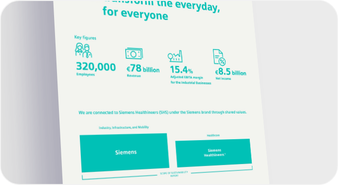 Our Purpose We create technology to transform the everyday, for everyone Key figures 320,000 €78 billion 15.4% €8.5 billion Employees Revenue Adjusted EBITA margin Net income for the Industrial Businesses We are connected to Siemens Healthineers (SHS) under the Siemens brand through shared values. Industry, Infrastructure, and Mobility Healthcare Siemens Siemens Healthineers1 SCOPE OF SUSTAINABILITY REPORT All indicators in the report include Siemens Healthineers (SHS), unless otherwise noted. For the sake of readability, the masculine form is used; it is representative of people of any gender. 1 Publicly listed subsidiary of Siemens; Siemens’ share in Siemens Healthineers: 75%. SIEMENS SUSTAINABILITY REPORT 2023 2