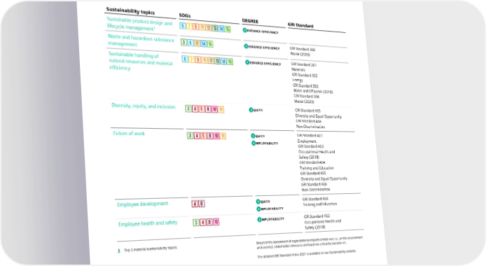 7.5 GRI Standards – key topics and boundaries Sustainability topics SDGs DEGREE GRI Standard Sustainable product design and R ESOURCE EFFICIENCY lifecycle management1 Waste and hazardous substance R ESOURCE EFFICIENCY GRI Standard 306 management Waste (2020) Sustainable handling of R ESOURCE EFFICIENCY GRI Standard 301 natural resources and material Materials efficiency GRI Standard 302 Energy GRI Standard 303 Water and Effluents (2018) GRI Standard 306 Waste (2020) Diversity, equity, and inclusion E QUITY GRI Standard 405 Diversity and Equal Opportunity GRI Standard 406 Non-Discrimination Future of work E QUITY GRI Standard 401 E MPLOYABILITY Employment GRI Standard 403 Occupational Health and Safety (2018) GRI Standard 404 Training and Education GRI Standard 405 Diversity and Equal Opportunity GRI Standard 406 Non Discrimination Employee development E QUITY GRI Standard 404 E MPLOYABILITY Training and Education Employee health and safety E MPLOYABILITY GRI Standard 403 Occupational Health and Safety (2018) 1 Top 2 material sustainability topics. Result of the assessment of organizational impacts (inside-out, i.e., on the environment and society), stakeholder relevance and business criticality (outside-in). The detailed GRI Standard Index 2021 is available on our Sustainability website. SIEMENS SUSTAINABILITY REPORT 2023 145