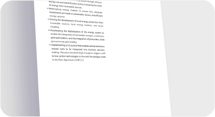 4.1 Climate action Beyond our various measures and activities, Siemens also participates in committees and associations where it advo- cates for more changes in climate policy frameworks in order to support the following activities: → Accelerating decarbonization in all sectors through efficient energy use and electrification and by increasing the share of energy from renewable sources → Redesigning energy markets to ensure that adequate investments are made in sustainable, secure, and efficient energy systems → Driving the development of local energy production from renewable sources, local energy markets, and sector coupling → Accelerating the digitalization of the energy system to enable the integration of renewable energies, continuous grid optimization, and the integration of prosumers, while guaranteeing grid stability → Implementing a CO e price that enables actual emissions- 2 related costs to be integrated into business decision- making. The price should be high enough to trigger a shift to low-carbon technologies in line with the pledges made in the Paris Agreement (COP 21). SIEMENS SUSTAINABILITY REPORT 2023 64