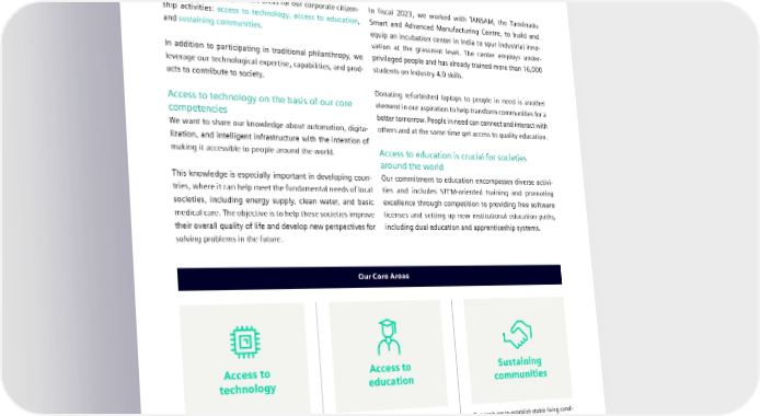5.5 Corporate citizenship Actions and results In addition, by equipping research laboratories with control and automation equipment in countries like Hungary, Turkey, Scale sustainability impact with a shared value and Latvia, Siemens is helping improve educational and approach employment opportunities. Grounded in our core business and competencies, we have defined three strategic focus areas for our corporate citizen- In fiscal 2023, we worked with TANSAM, the Tamilnadu ship activities: access to technology, access to education, Smart and Advanced Manufacturing Centre, to build and and sustaining communities. equip an incubation center in India to spur industrial inno- vation at the grassroot level. The center employs under- In addition to participating in traditional philanthropy, we privileged people and has already trained more than 16,000 leverage our technological expertise, capabilities, and prod- students on Industry 4.0 skills. ucts to contribute to society. Donating refurbished laptops to people in need is another Access to technology on the basis of our core element in our aspiration to help transform communities for a competencies better tomorrow. People in need can connect and interact with We want to share our knowledge about automation, digita- others and at the same time get access to quality education. lization, and intelligent infrastructure with the intention of making it accessible to people around the world. Access to education is crucial for societies around the world This knowledge is especially important in developing coun- Our commitment to education encompasses diverse activi- tries, where it can help meet the fundamental needs of local ties and includes STEM-oriented training and promoting societies, including energy supply, clean water, and basic excellence through competition to providing free software medical care. The objective is to help these societies improve licenses and setting up new institutional education paths, their overall quality of life and develop new perspectives for including dual education and apprenticeship systems. solving problems in the future. Our Core Areas Access to Access to Sustaining technology education communities With the aid of our core competencies in Knowledge is a resource on which our future Our goals are to establish stable living condi- digitalization, automation, and electrifica- depends. Therefore, improving educational tions, protect values, unleash creativity, tion, as well as scientific research, we strive prospects and allowing broad access to improve intercultural understanding, and to give as many people as possible the education are critically important challenges contribute to progress. chance to use the latest technologies. for all societies everywhere in the world. SIEMENS SUSTAINABILITY REPORT 2023 103