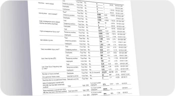 6 Our sustainability indicators Sustainability Key Performance Indicators Fiscal Year/ (KPIs) September 30th Unit FY 2023 FY 2022 +/– Standards Siemens Graduate Program (SGP) Total community Sept. 30th No. 954 913 4.5% GRI 404-2, WEF Active participants Sept. 30th No. 132 99 33.3% GRI 404-2, WEF Occupational health & safety34 Total Fiscal Year No. 4 2 100.0% GRI 403-9, WEF Fatalities – work related Temporary workers Fiscal Year No. 0 0 GRI 403-9, WEF Employees Fiscal Year No. 0 1 −100.0% GRI 403-9, WEF Contractors Fiscal Year No. 4 1 300.0% GRI 403-9, WEF Total36 Fiscal Year No. 0.000 0.001 –100.0% GRI 403-9, WEF Fatality Rate – work related35 Temporary workers Fiscal Year No. 0.000 0.000 GRI 403-9, WEF Employees Fiscal Year No. 0.000 0.0003 −100.0% GRI 403-9, WEF Total Fiscal Year No. 50 68 −26.5% GRI 403-9, WEF High-consequence work-related Temporary workers Fiscal Year No. 3 1 200.0% GRI 403-9, WEF injuries (excluding fatalities) Employees Fiscal Year No. 47 67 −29.9% GRI 403-9, WEF Total Fiscal Year No. 0.015 0.021 –28.5% GRI 403-9, WEF High-consequence injury rate37 Temporary workers Fiscal Year No. 0.009 0.003 178.4% GRI 403-9, WEF Employees Fiscal Year No. 0.015 0.022 –31.4% GRI 403-9, WEF Total Fiscal Year No. 1,466 1,518 −3.4% GRI 403-9, WEF Recordable injuries Temporary workers Fiscal Year No. 199 210 −5.2% GRI 403-9, WEF Employees Fiscal Year No. 1,267 1,308 −3.1% GRI 403-9, WEF Total Fiscal Year No. 0.43 0.46 –6.1% GRI 403-9, WEF Total recordable injury rate38 Temporary workers Fiscal Year No. 0.63 0.71 –12.1% GRI 403-9, WEF Employees Fiscal Year No. 0.41 0.44 –5.3% GRI 403-9, WEF Total Fiscal Year No. 805 853 −5.6% GRI 403-9, WEF Lost time injuries (LTI) Temporary workers Fiscal Year No. 96 112 −14.3% GRI 403-9, WEF Employees Fiscal Year No. 709 741 −4.3% GRI 403-9, WEF Total Fiscal Year No. 0.24 0.26 −8.2% GRI 403-9, WEF Lost time injury frequency rate Temporary workers Fiscal Year No. 0.30 0.38 −20.5% GRI 403-9, WEF (LTIFR)39 Employees Fiscal Year No. 0.23 0.25 −6.5% GRI 403-9, WEF Number of hours worked Employees Fiscal Year No. (in thousand) 614,731 600,758 2.3% GRI 403-9 Occupational Illness cases Selected countries Fiscal Year No. 62 8840 −29.5% GRI 403-10, WEF Fatalities due to occupational Illness Selected countries Fiscal Year No. 6 1140 –45.5% GRI 403-10 Rate of employees covered with OHS MS that has been externally % of total number audited Total Sept. 30th employees 57% 57%41 0.0% GRI 403-8 Rate employees covered with OHS % of total number MS that has been internally audited Total (w/o SHS) Sept. 30th employees 99.9% n.a. GRI 403-8 % of total number Rate of access to Medical Care42 Total (w/o SHS) Sept. 30th employees 99% 89% 11.8% GRI 403-6 % of total number Rate of access to Health Education42 Total (w/o SHS) Sept. 30th employees 94% 85% 11.0% 34 Excluding CTSI Oncology Solutions. 35 Number of Fatalities x 200,000 / working hours. 36 Fatality Rate w/o contractors. 37 Number of High-consequence injuries x 200,000 / working hours. 38 Number of Recordable injuries x 200,000 / working hours. 39 Number of Lost Time Cases (LTC) x 200,000 / working hours. LTC are accidents that results in at least one lost working day. 40 Due to system change of German Statutory Agency adjusted prior year figures. 41 Realignment due to calculation error in last year. 42 Scope of HM Reporting: Countries >30 employees as well as affiliated companies >30 employees. SIEMENS SUSTAINABILITY REPORT 2023 122