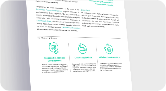 Holistic environmental protection Our Eco Efficiency @ Siemens program Our Eco Efficiency @ Siemens program addresses environ- DEGREE, Eco Efficiency @ Siemens, mental factors specific to our products, systems, solutions, and our environmental initiatives and services and our production. It also defines objectives give Siemens a broad range of for improving our environmental management: for example, instruments to guide our objectives by encouraging a circular economy and generally demateri- in environmental protection alizing our business processes. The program has three components. At the center of the Green Deal Responsible Product Development program component is We continue to pursue the Green Deals @ Siemens project our Robust Eco Design approach. The program intends to with the goal of evaluating the European Union’s Green introduce methods and rules for dematerialization along the Deal policy and similar developments around the world and entire value chain. The second component of the program, a implementing the associated requirements. Specialized Clean Supply Chain, aims to increase the percentage of sec- project groups are working to ensure that the legal require- ondary materials we use and to reduce regulated substances ments are implemented efficiently. by 2030. The third component, Efficient Own Operations, aims to reduce environmental impacts at our own sites. Eco Efficiency @ Siemens Responsible Product Clean Supply Chain Efficient Own Operations Development Products and solutions are at the core of A clean supply chain is central to the journey At the heart of our environmental approach our business. Evaluating our portfolio and of decoupling natural resource use. That is is our ability to efficiently manage our applying an Ecodesign approach to rele- why we will increasingly source secondary production sites and offices – especially by vant product families supports us in selling materials and take action to replace regu- enhancing waste management practices eco-efficient products and solutions. lated substances according to IEC 62474. and using clean energy. SIEMENS SUSTAINABILITY REPORT 2023 57