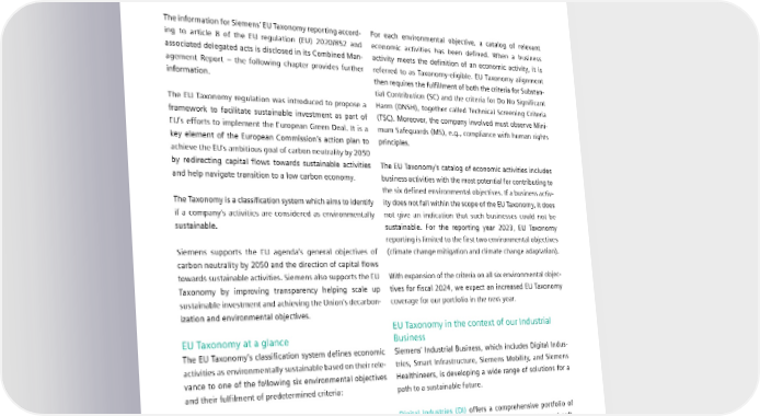 4.4 EU taxonomy 4.4 EU Taxonomy The information for Siemens’ EU Taxonomy reporting accord- For each environmental objective, a catalog of relevant ing to article 8 of the EU regulation (EU) 2020/852 and economic activities has been defined. When a business associated delegated acts is disclosed in its Combined Man- activity meets the definition of an economic activity, it is agement Report – the following chapter provides further referred to as Taxonomy-eligible. EU Taxonomy alignment information. then requires the fulfillment of both the criteria for Substan- tial Contribution (SC) and the criteria for Do No Significant The EU Taxonomy regulation was introduced to propose a Harm (DNSH), together called Technical Screening Criteria framework to facilitate sustainable investment as part of (TSC). Moreover, the company involved must observe Mini- EU’s efforts to implement the European Green Deal. It is a mum Safeguards (MS), e.g., compliance with human rights key element of the European Commission’s action plan to principles. achieve the EU’s ambitious goal of carbon neutrality by 2050 by redirecting capital flows towards sustainable activities The EU Taxonomy’s catalog of economic activities includes and help navigate transition to a low carbon economy. business activities with the most potential for contributing to the six defined environmental objectives. If a business activ- The Taxonomy is a classification system which aims to identify ity does not fall within the scope of the EU Taxonomy, it does if a company’s activities are considered as environmentally not give an indication that such businesses could not be sustainable. sustainable. For the reporting year 2023, EU Taxonomy reporting is limited to the first two environmental objectives Siemens supports the EU agenda’s general objectives of (climate change mitigation and climate change adaptation). carbon neutrality by 2050 and the direction of capital flows towards sustainable activities. Siemens also supports the EU With expansion of the criteria on all six environmental objec- Taxonomy by improving transparency helping scale up tives for fiscal 2024, we expect an increased EU Taxonomy sustainable investment and achieving the Union’s decarbon- coverage for our portfolio in the next year. ization and environmental objectives. EU Taxonomy in the context of our Industrial EU Taxonomy at a glance Business The EU Taxonomy’s classification system defines economic Siemens’ Industrial Business, which includes Digital Indus- activities as environmentally sustainable based on their rele- tries, Smart Infrastructure, Siemens Mobility, and Siemens vance to one of the following six environmental objectives Healthineers, is developing a wide range of solutions for a and their fulfilment of predetermined criteria: path to a sustainable future. I. Climate change mitigation Digital Industries (DI) offers a comprehensive portfolio of - II. Climate change adaptation products, services and solutions for automation and soft Sustainable use and protection of water and marine ware for the discrete and process industries. It enables III. resources customers to optimize their entire value chain from product IV. Transition to a circular economy design, development, and production facility modeling to V. Pollution prevention and control production operation and after-sales service. The Digital VI. Protection and restoration of biodiversity and ecosystems Industry portfolio enhances efficiency, conserves resources, and reduces greenhouse gas emissions. SIEMENS SUSTAINABILITY REPORT 2023 76