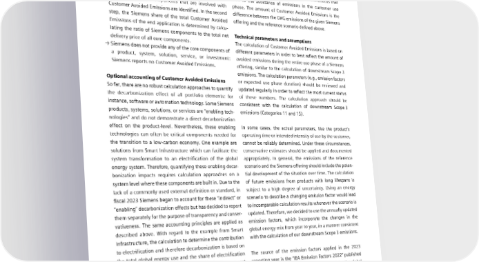 7.2 Reporting principles for Customer Avoided Emissions → Siemens provides all core component(s), even if they only Calculation represent intermediate products of an end application: Siemens Businesses and SFS are required, where applicable, Siemens accounts for 100% of the Customer Avoided to report Customer Avoided Emissions associated with all Emissions during the customer use phase. products, systems, solutions, services, or investments that → Siemens provides some of the core component(s): In the lead to the avoidance of emissions in the customer use first step, all core components that are involved with phase. The amount of Customer Avoided Emissions is the Customer Avoided Emissions are identified. In the second difference between the GHG emissions of the given Siemens step, the Siemens share of the total Customer Avoided offering and the reference scenario defined above. Emissions of the end application is determined by calcu- lating the ratio of Siemens components to the total net Technical parameters and assumptions delivery price of all core components. The calculation of Customer Avoided Emissions is based on → Siemens does not provide any of the core components of different parameters in order to best reflect the amount of a product, system, solution, service, or investment: avoided emissions during the entire use phase of a Siemens Siemens reports no Customer Avoided Emissions. offering, similar to the calculation of downstream Scope 3 emissions. The calculation parameters (e.g., emission factors Optional accounting of Customer Avoided Emissions or expected use phase duration) should be reviewed and So far, there are no robust calculation approaches to quantify updated regularly in order to reflect the most current status the decarbonization effect of all portfolio elements: for of these numbers. The calculation approach should be instance, software or automation technology. Some Siemens consistent with the calculation of downstream Scope 3 products, systems, solutions, or services are “enabling tech- emissions (Categories 11 and 15). nologies” and do not demonstrate a direct decarbonization effect on the product-level. Nevertheless, these enabling In some cases, the actual parameters, like the product’s technologies can often be critical components needed for operating time or intended intensity of use by the customer, the transition to a low-carbon economy. One example are cannot be reliably determined. Under these circumstances, solutions from Smart Infrastructure which can facilitate the conservative estimates should be applied and documented system transformation to an electrification of the global appropriately. In general, the emissions of the reference energy system. Therefore, quantifying these enabling decar- scenario and the Siemens offering should include the poten- bonization impacts requires calculation approaches on a tial development of the situation over time. The calculation system level where these components are built in. Due to the of future emissions from products with long lifespans is lack of a commonly used external definition or standard, in subject to a high degree of uncertainty. Using an energy fiscal 2023 Siemens began to account for these “indirect” or scenario to describe a changing emission factor would lead “enabling” decarbonization effects but has decided to report to incomparable calculation results whenever the scenario is them separately for the purpose of transparency and conser- updated. Therefore, we decided to use the annually updated vativeness. The same accounting principles are applied as emission factors, which incorporate the changes in the described above. With regard to the example from Smart global energy mix from year to year, in a manner consistent Infrastructure, the calculation to determine the contribution with the calculation of our downstream Scope 3 emissions. to electrification and therefore decarbonization is based on the total global energy use and the share of electrification The source of the emission factors applied in the 2023 and automation solutions from Smart Infrastructure as part reporting year is the “IEA Emission Factors 2022” published of the total global investment in electrification. The eligible by the International Energy Agency. For example, the global revenue, based on the EU Taxonomy, is included in the CO2e emissions factor used for electricity generation only is calculation along with the grid mix evolution of electricity 461 g CO e/kWh. 2 generation. SIEMENS SUSTAINABILITY REPORT 2023 130