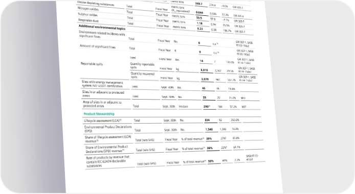 6 Our sustainability indicators Sustainability Key Performance Indicators Fiscal Year/ (KPIs) September 30th Unit FY 2023 FY 2022 +/– Standards Rate of sites with implemented water strategy Total Sept. 30th % of sites 96% 93% 3.8% GRI 303-1, WEF Atmospheric pollutant emissions Volatile Organic Compounds Total Fiscal Year metric tons 249.7 274.4 −9.0% GRI 305-7 metric tons 9 Ozone-depleting substances Total Fiscal Year (R11 equivalent) 0.044 0.036 22.3% GRI 305-6 Nitrogen oxides Total Fiscal Year metric tons 53.5 57.6 −7.1% GRI 305-7 Sulphur oxides Total Fiscal Year metric tons 1.18 0.94 25.5% GRI 305-7 Respirable dust Total Fiscal Year metric tons 0.23 0.08 186.7% GRI 305-7 Additional environmental topics Environment-related incidents with GRI 307-1, SASB significant fines Total Fiscal Year No. 0 n.a.10 RT-EE-150a2 GRI 307-1, SASB Amount of significant fines Total Fiscal Year € 0 n.a.10 RT-EE-150a2 GRI 307-1, SASB Total Fiscal Year No. 14 7 100.0% RT-EE-150a2 Reportable spills Quantity reportable GRI 307-1, SASB spills Fiscal Year kg 3,319 2,562 29.5% RT-EE-150a2 Quantity recovered GRI 307-1, SASB spills Fiscal Year kg 2,079 342 507.7% RT-EE-150a2 Sites with energy management system ISO 50001 certification Total Sept. 30th No. 45 38 18.4% Sites in or adjacent to protected areas Total Sept. 30th No. 25 20 25.0% WEF Area of sites in or adjacent to protected areas Total Sept. 30th Hectare 29011 184 57.2% WEF Product Stewardship Lifecycle assessment (LCA)12 Total Sept. 30th No. 334 92 263.0% Environmental Product Declarations (EPD) Total Sept. 30th No. 1,540 1,346 14.4% Share of lifecycle assessment (LCA) 13 14 8 revenue Total (w/o SHS) Fiscal Year % of total revenue 39% 27% 45.8% Share of Environmental Product 13 14 8 Declarations (EPD) revenue Total (w/o SHS) Fiscal Year % of total revenue 36% 22% 64.1% Rate of products by revenue that contain IEC 62474-declarable SASB RT-EE- 14 substances Total (w/o SHS) Fiscal Year % of total revenue 50% 49% 2.2% 410a1 8 Change in last year data caused by new calculation method. 9 R11 equivalent measures ozone depletion potential. 10 Change in last year data caused by new definition with threshold. 11 Therein 49 hectare of an office location without production in Erlangen/Germany. 12 Full-scale. 13 Based on 3rd party revenue with products. 14 Siemens without SHS. SIEMENS SUSTAINABILITY REPORT 2023 114