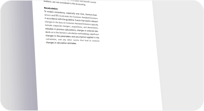 7.2 Reporting principles for Customer Avoided Emissions If regional calculations are available, local emissions factors should be used. Offerings with no material Customer Avoided Emissions impact, or in cases where the calculation cannot be reliably determined when applying reasonable cost-benefit consid- erations, are not considered in the accounting. Recalculation To enable consistency, especially over time, Siemens Busi- nesses and SFS recalculate the Customer Avoided Emissions in accordance with the guideline. Events that lead to relevant changes in the data on Customer Avoided Emissions typically include corporate mergers, acquisitions, and divestments, mistakes in previous calculations, changes in external stan- dards or in the Siemens calculation methodology, significant changes in the parameters and assumptions applied in the calculation, and any other events that lead to material changes in calculation estimates. SIEMENS SUSTAINABILITY REPORT 2023 131