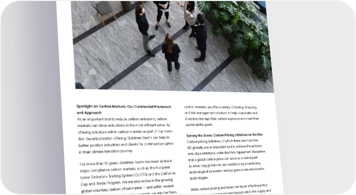 CLIMATE TRANSITION Spotlight on Carbon Markets: Our Commercial Framework carbon markets, we offer a variety of trading, financing, and Approach and risk management solutions to help corporates and As an important tool to reduce carbon emissions, carbon investors manage their carbon exposure and meet their markets can drive reductions at the most efficient price. By sustainability goals. offering solutions within carbon markets as part of our cross- firm Decarbonization offering, Goldman Sachs can help to Setting the Scene: Carbon Pricing Initiatives on the Rise better position industries and clients for continued progress Carbon pricing initiatives, of which there are more than in their climate transition journey. 60 globally, are an important tool to achieve the emission reduction ambitions under the Paris Agreement. We believe For more than 10 years, Goldman Sachs has been active in that a global carbon price can serve as a critical path major compliance carbon markets, such as the European to advancing global net zero ambitions by incentivizing Union Emissions Trading System (EU ETS) and the California technological innovation and progress in decarbonization Cap and Trade Program. We are also active in the growing technologies. global voluntary carbon offset market — and within several industry and advisory bodies. For example, we are members While carbon pricing and taxes can be an effective policy of the “Taskforce on Scaling Voluntary Carbon Markets,” a instrument, market-based mechanisms allow the supply and private sector-led initiative working to scale an effective and demand for carbon allowances — or credits — to determine efficient voluntary carbon market to help meet the the price of carbon. These voluntary markets can effectively Paris Agreement goals. Within the compliance and voluntary aim to drive finance to activities that reduce emissions. Sustainability Report 2021 Climate Transition | Driving Transition 24