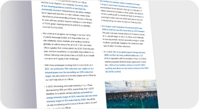 CLIMATE TRANSITION Progress Toward Our 2025 Goals 2021 is the first year for reporting progress toward our efforts. While COVID-19 continued to have an impact on our operations and supply chain during the last year, we remained focused on our commitments. • We increased our efforts to advance smarter sourcing • We continue to maintain carbon neutrality for Scope choices for the cleaning products used in our offices 1, Scope 2, and Scope 3 business travel emissions, and and the food offered in our cafeterias. Currently, 40% we neutralized these emissions through a combination of of our cleaning products and 21% of our food are carbon removal and avoidance offset credits. We intend to sustainably sourced. These products are either certified continue working with our investment team to increase our by an approved standard or meet outlined criteria to be sourcing of carbon removal credits each year as we work classified as environmentally preferred. We are continuing toward phasing out carbon avoidance offsets by 2030. to work with key vendors toward meeting our commitment of 100% green cleaning products and 50% sustainably • Our Scope 1 and 2 emissions increased by 60% from sourced food by 2025. 2020 to 2021 but are 25% lower than our 2017 baseline. This year-over-year change reflects an increase in activity • We continue to progress our strategy to remove 100% as our people began to return to offices, and challenges of plastic beverage bottles and disposables from on- in sourcing market-matched renewable energy in certain site cafeterias, micro-markets, and vending machines locations, specifically Singapore. We continue to seek globally, as well as reduce the amount of firm-provided opportunities for further reductions. office supplies that contain plastic by 2025. Over the past year, we have reverted to compostable disposables in our • As of 2021, 74% of our global square footage has been offices following a temporary hiatus in 2020 due to health LEED certified. All newly certified facilities are LEED concerns and supply chain challenges. Gold or equivalent, with the exception of two LEED Silver certified properties that had leases signed prior to 2021. • With many employees working from home in 2020 and Also, 100% of our facilities continue to be ISO 14001 2021, we achieved a 79% reduction per-capita on our certified, and all our on-site events continue to be 100% internal paper use, far exceeding our 30% reduction ISO 20121 certified. target. We will continue to monitor paper use in offices as our staff fully returns to offices. • In 2021, the energy and water intensity of our offices decreased by 36% and 42%, respectively, from a 2017 baseline. As a result, we have already exceeded our energy intensity target of 20% reduction and our water intensity target of 15% reduction by 2025. We will be closely monitoring performance of these metrics as staff fully returns to our offices. • We continue to procure 100% renewable energy for all of our global electricity consumption — and work toward our commitment to have 80% of this from long-term contracts. Sustainability Report 2021 Climate Transition | Driving Sustainability in Our Own Business 44
