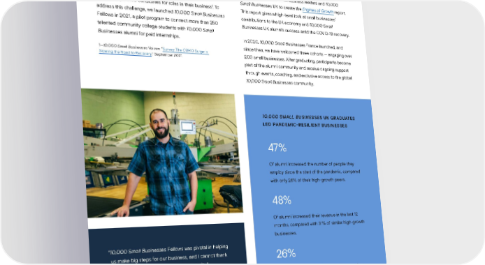 INCLUSIVE GROWTH Launching a Workforce 10,000 Small Businesses Solution: 10,000 Small in France and the UK Businesses Fellows Pilot In December 2021, we synthesized insights from one thousand of the UK’s small business leaders and 10,000 Nearly 90% of small business owners report difficulty in Small Businesses UK to create the Engines of Growth report. 1. To recruiting qualified candidates for roles in their business This report gives a high-level look at small businesses’ address this challenge, we launched 10,000 Small Businesses contributions to the UK economy and 10,000 Small Fellows in 2021, a pilot program to connect more than 250 Businesses UK alumni’s success amid the COVID-19 recovery. talented community college students with 10,000 Small Businesses alumni for paid internships. In 2020, 10,000 Small Businesses France launched, and since then, we have welcomed three cohorts — engaging over 1—10,000 Small Businesses Voices: “Survey: The COVID Surge is 200 small businesses. After graduating, participants become Slowing the Road to Recovery,” September 2021. part of the alumni community and receive ongoing support through events, coaching, and exclusive access to the global 10,000 Small Businesses community. 10,000 SMALL BUSINESSES UK GRADUATES LED PANDEMIC-RESILIENT BUSINESSES 47% Of alumni increased the number of people they employ since the start of the pandemic, compared with only 26% of their high-growth peers. 48% Of alumni increased their revenue in the last 12 months, compared with 31% of similar high-growth businesses. “10,000 Small Businesses Fellows was pivotal in helping us make big steps for our business, and I cannot thank 26% Goldman Sachs enough for the opportunity.” TED HILL Of alumni increased their revenue by more than Life Benefits, Dallas, TX 20% from the previous year. 10,000 Small Businesses Graduate and Fellows Host Sustainability Report 2021 Inclusive Growth | Leveraging Partnerships 76