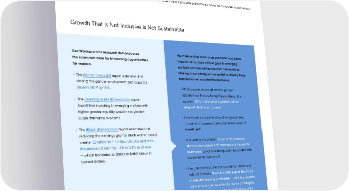 Introduction INCLUSIVE GROWTH The Economic Imperative for Inclusive Growth Inclusive growth is critical to a healthier, more vibrant economy for all and is a powerful performance driver for companies and investors. Growth That Is Not Inclusive Is Not Sustainable Our Womenomics research demonstrates We believe that there is an economic and social the economic case for increasing opportunities imperative to close access gaps in emerging for women. markets and low socioeconomic communities. Making these changes is essential to driving long- • The Womenomics 5.0 report estimates that term inclusive, sustainable outcomes. closing the gender employment gap could lift Japan’s GDP by 15%. • While people across all income groups experienced losses during the pandemic, the • The Investing in EM Womenomics report poorest 20% of the world experienced the found that investing in emerging markets with steepest decline in incomes1. higher gender equality would have yielded outperformance over time. • Low-income countries show the highest rates of women’s business startup but lower levels of • The Black Womenomics report estimates that investment2. reducing the earnings gap for Black women could create 1.2 million to 1.7 million US jobs and raise • In a variety of contexts, lower socioeconomic the annual US GDP by 1.4% to 2.1% each year status is associated with more access barriers to — which translates to $300 to $450 billion in healthcare, which is subsequently associated with current dollars. worse health outcomes3. • For companies in the top quartile for ethnic and cultural diversity, there is a 36% higher likelihood of industry-leading profitability — and top-quartile companies in gender diversity have a 25% higher 1—Worldbank: “2021 Year in Review in 11 Charts: The Inequality likelihood of outperforming on profitability when Pandemic,” December 2021. compared to less diverse companies4. 2—Global Entrepreneurship Monitor: “COVID-19 Impacts on Yet, women-only founded companies received Women Entrepreneurs in Emerging Economies: Insights and Indicators,” February 2022. only 2% of US VC investment, and Black 3—Frontiers in Public Health: “Socioeconomic Status and entrepreneurs received just 1.2% in the first half Access to Healthcare: Interrelated Drivers for Healthy Aging,” June 2020. of 20215. 4—McKinsey & Company: “Diversity wins: How inclusion matters,”May 2020. Sustainability Report 2021 5—Crunchbase: “Black Women Still Receive Just A Tiny Fraction Inclusive Growth | Introduction 50 Of VC Funding Despite 5-Year High,” July 2021.