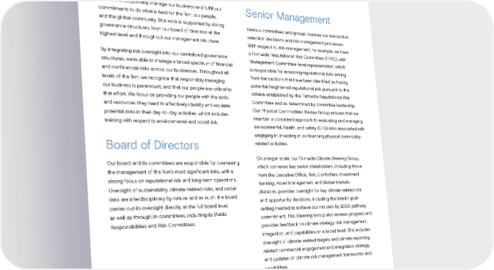 Governance at Our Firm GOVERNANCE At Goldman Sachs, the way we do business is informed by our purpose: to advance sustainable economic growth and financial opportunity. This purpose applies to our entire firm — from our work with clients and partners to how we manage environmental and social risk. We seek to responsibly manage our business and fulfill our Senior Management commitments to do what is best for the firm, our people, and the global community. This work is supported by strong Various committees and groups oversee our transaction governance structures, from our board of directors at the selection decisions and risk management processes. highest level and throughout our management structure. With respect to risk management, for example, we have By integrating risk oversight into our centralized governance a Firmwide Reputational Risk Committee (FRRC), with structures, we’re able to manage a broad spectrum of financial Management Committee-level representation, which and nonfinancial risks across our businesses. Throughout all is responsible for assessing reputational risks arising levels of the firm, we recognize that responsibly managing from transactions that have been identified as having our business is paramount, and that our people are critical to potential heightened reputational risk pursuant to the that effort. We focus on providing our people with the tools criteria established by the Firmwide Reputational Risk and resources they need to effectively identify and escalate Committee and as determined by committee leadership. potential risks in their day-to-day activities, which includes Our Physical Commodities Review Group ensures that we training with respect to environmental and social risk. maintain a consistent approach to evaluating and managing environmental, health, and safety (EHS) risks associated with engaging in, investing in, or financing physical commodity- Board of Directors related activities. Our board and its committees are responsible for overseeing On a larger scale, our Firmwide Climate Steering Group, the management of the firm’s most significant risks, with a which convenes key senior stakeholders, including those strong focus on reputational risk and long-term operations. from the Executive Office, Risk, Controllers, Investment Oversight of sustainability, climate-related risks, and social Banking, Asset Management, and Global Markets risks are interdisciplinary by nature, and as such, the board divisions, provides oversight for key climate-related risk carries out its oversight directly, at the full board level, and opportunity decisions, including the interim goal- as well as through its committees, including its Public setting needed to achieve our net zero by 2050 pathway Responsibilities and Risk Committees. commitment. This Steering Group also reviews progress and provides feedback on climate strategy, risk management, integration, and capabilities on a broad level. This includes oversight of climate-related targets and climate reporting, related commercial engagement and integration strategy, and updates on climate risk management frameworks and capabilities. Sustainability Report 2021 Governance 88