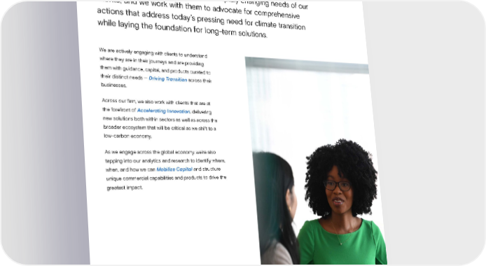 Our Work With Clients CLIMATE TRANSITION At Goldman Sachs, we leverage our OneGS model to deliver multifaceted client solutions that aim to execute on sustainability commitments. Across teams, divisions, and geographies, we constantly strive to understand the rapidly changing needs of our clients, and we work with them to advocate for comprehensive actions that address today’s pressing need for climate transition while laying the foundation for long-term solutions. We are actively engaging with clients to understand where they are in their journeys and are providing them with guidance, capital, and products curated to their distinct needs — Driving Transition across their businesses. Across our firm, we also work with clients that are at the forefront of Accelerating Innovation, delivering new solutions both within sectors as well as across the broader ecosystem that will be critical as we shift to a low-carbon economy. As we engage across the global economy, we’re also tapping into our analytics and research to identify where, when, and how we can Mobilize Capital and structure unique commercial capabilities and products to drive the greatest impact. Sustainability Report 2021 Climate Transition | Introduction 1919