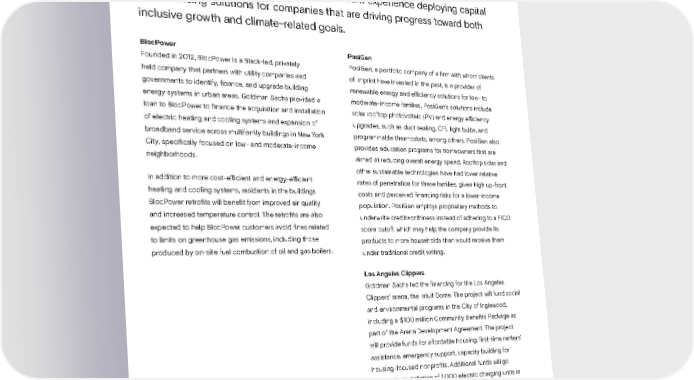 INCLUSIVE GROWTH We expect that our work to support an inclusive transition, in partnership with our clients, the public sector, and broader stakeholders, will continue to be an important area of focus for our firm as we look forward. As we look toward the future, we also look to learn from our recent experience deploying capital and financing solutions for companies that are driving progress toward both inclusive growth and climate-related goals. BlocPower PosiGen Founded in 2012, BlocPower is a Black-led, privately PosiGen, a portfolio company of a firm with whom clients held company that partners with utility companies and of Imprint have invested in the past, is a provider of governments to identify, finance, and upgrade building renewable energy and efficiency solutions for low- to energy systems in urban areas. Goldman Sachs provided a moderate-income families. PosiGen’s solutions include loan to BlocPower to finance the acquisition and installation solar rooftop photovoltaic (PV) and energy efficiency of electric heating and cooling systems and expansion of upgrades, such as duct sealing, CFL light bulbs, and broadband service across multifamily buildings in New York programmable thermostats, among others. PosiGen also City, specifically focused on low- and moderate-income provides education programs for homeowners that are neighborhoods. aimed at reducing overall energy spend. Rooftop solar and other sustainable technologies have had lower relative In addition to more cost-efficient and energy-efficient rates of penetration for these families, given high up-front heating and cooling systems, residents in the buildings costs and perceived financing risks for a lower-income BlocPower retrofits will benefit from improved air quality population. PosiGen employs proprietary methods to and increased temperature control. The retrofits are also underwrite creditworthiness instead of adhering to a FICO expected to help BlocPower customers avoid fines related score cutoff, which may help the company provide its to limits on greenhouse gas emissions, including those products to more households than would receive them produced by on-site fuel combustion of oil and gas boilers. under traditional credit writing. Los Angeles Clippers Goldman Sachs led the financing for the Los Angeles Clippers’ arena, the Intuit Dome. The project will fund social and environmental programs in the City of Inglewood, including a $100 million Community Benefits Package as part of the Arena Development Agreement. The project will provide funds for affordable housing, first-time renters’ assistance, emergency support, capacity building for housing-focused nonprofits. Additional funds will go toward the installation of 1,000 electric charging units in the city, and the arena is being built to be fully electrified and operates a zero-waste program using composting and recycling technologies. Sustainability Report 2021 Inclusive Growth | What to Expect Next 86