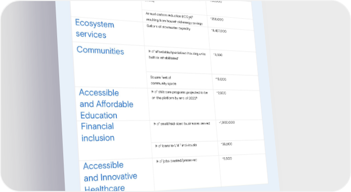 KPI REPORTING¹ Theme KPI Metric ~ Clean energy Clean energy projected to be produced 730,000 (MWh)2 3 ~ Annual carbon reduction (tCO e) 256,000 2 resulting from household energy savings Ecosystem Gallons of stormwater capacity ~8,457,000 services Communities # of affordable/specialized housing units ~3,330 4 built or rehabilitated ~ Square feet of 19,000 community space ~ Accessible # of childcare programs projected to be 2,800 on the platform by end of 20225 and Affordable Education Financial # of small/mid-sized businesses served ~1,900,000 inclusion 6 ~ # of loans to LMI individuals 38,500 Accessible # of jobs created/preserved ~5,500 and Innovative Healthcare 1 Key Performance Indicators (KPIs) represent aggregate metrics across all investments where data was available, as provided directly by the relevant companies. KPIs provided by companies pertain to total project impact. 2 Represents a projection for the expected amount of energy to be produced (MWh). MWh represents megawatt hours. 3 tCO e represents tonnes (t) of carbon dioxide (CO ) equivalent (e) 2 2 4 Represents the number of affordable/specialized housing units that Goldman Sachs provided financing for the construction and/or rehabilitation of and may still be under development. 5 Represents the number of childcare programs projected to be created by end of 2022. 6 Low-to-moderate income (LMI) households are defined as having income levels lower than 80% of the area median income. 125