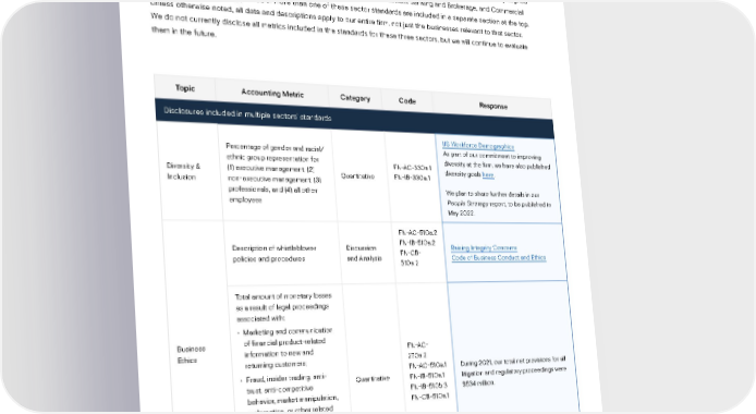 SASB Index KEY METRICS & INDICATORS This report is evidence of our ongoing commitment to provide disclosures under the Sustainability Accounting Standards Board (SASB) standards. We have included the below disclosures related to the three sectors that are most closely aligned to our mix of businesses: Asset Management and Custody Activities, Investment Banking and Brokerage, and Commercial Banks. Disclosures that appeared in more than one of these sector standards are included in a separate section at the top. Unless otherwise noted, all data and descriptions apply to our entire firm, not just the businesses relevant to that sector. We do not currently disclose all metrics included in the standards for these three sectors, but we will continue to evaluate them in the future. Topic Accounting Metric Category Code Response Disclosures included in multiple sectors’ standards US Workforce Demographics Percentage of gender and racial/ As part of our commitment to improving ethnic group representation for FN-AC-330a.1 diversity at the firm, we have also published Diversity & (1) executive management, (2) Quantitative FN-IB-330a.1 diversity goals here. Inclusion non-executive management, (3) professionals, and (4) all other We plan to share further details in our employees People Strategy report, to be published in May 2022. FN-AC-510a.2 Description of whistleblower Discussion FN-IB-510a.2 Raising Integrity Concerns policies and procedures and Analysis FN-CB- Code of Business Conduct and Ethics 510a.2 Total amount of monetary losses as a result of legal proceedings associated with: • Marketing and communication Business of financial product-related Ethics information to new and FN-AC- returning customers; 270a.2 • Fraud, insider trading, anti- FN-AC-510a.1 During 2021, our total net provisions for all trust, anti-competitive Quantitative FN-IB-510a.1 litigation and regulatory proceedings were behavior, market manipulation, FN-IB-510b.3 $534 million. malpractice, or other related FN-CB-510a.1 financial industry laws or regulations; and • Professional integrity, including duty of care SSuussttaaiinnaabbiilliittyy Re Reppoorrtt 2 2002121 KKeey My Meettrriiccs & Is & Innddiiccatatoorrs | Ss ASB Index 100