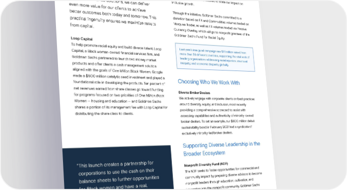 INCLUSIVE GROWTH 5 Commitment and Leadership Marquee for e-Quality Goldman Sachs recently announced the continuation of the Unlocking More Impact from Capital Marquee for e-Quality initiative for the second consecutive year. Building on the previous year’s success, we continue Through analysis, expertise, and curated to leverage commercial initiatives to scale our impact on inclusive growth. sustainable finance solutions, we can deliver even more value for our clients to achieve Through the initiative, Goldman Sachs committed to a better outcomes both today and tomorrow. This donation based on FX and Commodities volumes traded on practical ingenuity ensures we maximize results Marquee Trader, as well as FX volumes traded via Passive from capital. Currency Overlay, which will go to nonprofit grantees of the Goldman Sachs Fund for Racial Equity. Loop Capital To help promote racial equity and build diverse talent, Loop Last year’s inaugural campaign saw $1.1 million raised from Capital, a Black woman-owned financial services firm, and more than 56 different countries, supporting the vital work of leading organizations addressing racial injustice, structural Goldman Sachs partnered to launch two money market inequity, and economic disparity globally. products and offer clients a cash management solution aligned with the goals of One Million Black Women. Google made a $500 million catalytic seed investment and played a Choosing Who We Work With foundational role in developing the products. Ten percent of net revenues earned from share classes go toward funding Diverse Broker Dealers for programs focused on two priorities of One Million Black We actively engage with corporate clients on best practices Women — housing and education — and Goldman Sachs around diversity, equity, and inclusion, most recently shares a portion of its management fee with Loop Capital for providing a comprehensive scorecard to assist with distributing the share class to clients. assessing capabilities and authenticity of minority-owned broker dealers. To set an example, our $800 million debut sustainability bond in February 2021 had a syndicate of exclusively minority-led broker dealers. Supporting Diverse Leadership in the Broader Ecosystem “This launch creates a partnership for corporations to use the cash on their Nonprofit Diversity Fund (NDF) The NDF seeks to foster opportunities for commercial and balance sheets to further opportunities community impact by preparing diverse advisors to become for Black women and have a real, nonprofit leaders through education, cultivation, and lasting impact on communities far integration into the nonprofit community. Goldman Sachs and wide.” Private Wealth Management has committed $500,000 to cover board membership dues for diverse advisors to join nonprofit boards in their communities, thus decreasing the largest barrier to entry to board membership. KOURTNEY GIBSON President, Loop Capital Markets 71