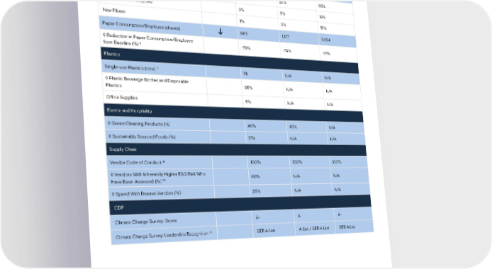 KEY METRICS & INDICATORS Trend 2021 2020 2019 2020-20211 Sourcing Paper Consumption (million sheets) 42 48 139 New Fibers (FSC/SFI) 96% 92% 66% Post-consumer Recycled 3% 5% 19% New Fibers 1% 3% 15% Paper Consumption/Employee (sheets) 965 1,177 3,634 ◊ Reduction in Paper Consumption/Employee -79% -74% -21% from Baseline (%) 3 Plastics Single-use Plastics (tons) 11 28 N/A N/A ◊ Plastic Beverage Bottles and Disposable 95% N/A N/A Plastics Office Supplies 5% N/A N/A Events and Hospitality ◊ Green Cleaning Products (%) 40% 43% N/A ◊ Sustainably Sourced Foods (%) 21% N/A N/A Supply Chain 12 Vendor Code of Conduct 100% 100% 100% ◊ Vendors With Inherently Higher ESG Risk Who 60% N/A N/A Have Been Assessed (%) 13 ◊ Spend With Diverse Vendors (%) 26% N/A N/A CDP Climate Change Survey: Score A- A A- Climate Change Survey: Leadership Recognition 14 SER A List A List / SER A List SER A List Note 1: Many metrics trending upward from 2020 to 2021 are primarily due to lifting COVID-19 restrictions and employees returning to the office. Note 3: This symbol ◊ before an indicator denotes an environmental commitment through Goldman’s 2025 ESG and Net Zero Commitments and ongoing 2020 Operational Commitments. Net Emissions noted as zero represents achievement of the firm’s carbon neutral commitment across operations and business travel. Reductions are from a 2017 baseline, except plastics which are from a 2021 baseline or where otherwise noted. Note 11: 2021 is the new baseline year for single-use plastic since data boundary has increased and data collection has improved. Note 12: All newly onboarded vendors must attest to the Vendor Code of Conduct. All vendors are screened for inherent ESG risks. Note 13: All vendors who we deem to have an inherently higher ESG risk and are over our material spend threshold are now required to complete an ESG questionnaire within 60 days of onboarding. Note 14: In 2019, 2020, and 2021, the firm’s CDP response was recognized for leadership as part of CDP’s Supplier Engagement Rating (SER). Historical data points may be adjusted to reflect new information and/or changes to protocols. SSuussttaaiinnaabbiilliittyy Re Reppoorrtt 2 2002121 KKeey My Meettrriiccs & Is & Innddiiccatatoorrs | Es nvironmental Indicators 97