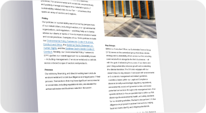 GOVERNANCE Policy, Process, and Key Groups Risk management is critical to the way we run our business, and it is deeply ingrained in our culture and business practices. For environmental and social risk, we proactively and publicly manage and report the material impacts of sustainability-related risks to our firm — a business that spans an array of sectors and regions. Policy Our policies on sustainability are informed by perspectives of our stakeholders, including investors, non-governmental organizations, and regulators — and they help us to better advise our clients in terms of how to improve environmental and social practices. Examples of our firm’s policies include our Environmental Policy Framework, Code of Business Conduct and Ethics, the Goldman Sachs Statement on Key Groups Human Rights, and the Goldman Sachs Vendor Code of Within our Executive Office, our Sustainable Finance Group Conduct. Notably, our Environmental Policy Framework (SFG) serves as the centralized group that drives climate (EPF) guides our overall approach to sustainability issues strategy and sustainability efforts across our firm, including — including management of environmental and social risk commercial efforts alongside the firm’s businesses — all across a broad scope of sectors and products. with the goal of advancing the success of our clients and promoting sustainable, inclusive growth and accelerating Process the climate transition. The SFG also engages with our Our advisory, financing, and direct investing teams include stakeholders to stay abreast of and assist with environmental environmental and social due diligence as integral parts of their and social risk management and related guidelines. process. Transactions that may have significant environmental In addition, teams within our Legal and Compliance or social risks, including reputational risks, are elevated for divisions broadly examine legal, regulatory, reputational, enhanced review and business selection discussion. environmental, social, and governance risks, and review potential transactions through a risk-management lens. At an operational level, in-house specialist teams within our Risk division guide environmental, health, and safety standards for our investing activities. The teams also perform EHS due diligence on proposed investment transactions, helping business teams identify and mitigate potential risk. With respect to climate risk specifically, the Risk division is responsible for the development of the firm’s climate risk program, including setting and evaluating risk appetite, assessing climate risk, and integrating that risk into business and risk management practices. Sustainability Report 2021 Governance 89