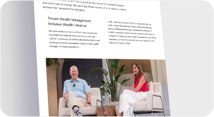 INCLUSIVE GROWTH 5 Commitment and Leadership Supporting Inclusive Wealth As diverse populations continue to grow across the world, the face of wealth also continues to change. We see a significant opportunity to help our clients achieve their personal financial goals. Private Wealth Management In the Lead was launched in 2021 to help ultra-high net Inclusive Wealth Initiative worth women take the lead in their wealth, philanthropy, legacy, and beyond through a streamlined collection of We have made a conscious effort to ensure we have insights, resources, advice, and an exclusive community of accessible and relevant resources for women, the women who build upon each other’s experiences. We will be LGBTQ+ community, and ethnically diverse clients, and expanding our efforts to include resources specific to the we are proud to be considered a best-in-class wealth Black community in 2022. manager for these populations. Sustainability Report 2021 Inclusive Growth | Defining and Executing on Our Strategy 73
