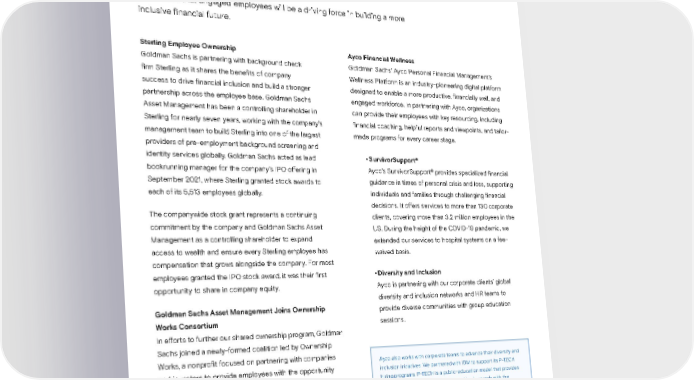 INCLUSIVE GROWTH 5 Commitment and Leadership Empowering Workers We believe that engaged employees will be a driving force in building a more inclusive financial future. Sterling Employee Ownership Ayco Financial Wellness Goldman Sachs is partnering with background check Goldman Sachs’ Ayco Personal Financial Management’s firm Sterling as it shares the benefits of company Wellness Platform is an industry-pioneering digital platform success to drive financial inclusion and build a stronger designed to enable a more productive, financially well, and partnership across the employee base. Goldman Sachs engaged workforce. In partnering with Ayco, organizations Asset Management has been a controlling shareholder in can provide their employees with key resourcing, including Sterling for nearly seven years, working with the company’s financial coaching, helpful reports and viewpoints, and tailor- management team to build Sterling into one of the largest made programs for every career stage. providers of pre-employment background screening and ® identity services globally. Goldman Sachs acted as lead • SurvivorSupport ® bookrunning manager for the company’s IPO offering in Ayco’s SurvivorSupport provides specialized financial September 2021, where Sterling granted stock awards to guidance in times of personal crisis and loss, supporting each of its 5,513 employees globally. individuals and families through challenging financial decisions. It offers services to more than 130 corporate The companywide stock grant represents a continuing clients, covering more than 3.2 million employees in the commitment by the company and Goldman Sachs Asset US. During the height of the COVID-19 pandemic, we Management as a controlling shareholder to expand extended our services to hospital systems on a fee- access to wealth and ensure every Sterling employee has waived basis. compensation that grows alongside the company. For most employees granted the IPO stock award, it was their first • Diversity and Inclusion opportunity to share in company equity. Ayco is partnering with our corporate clients’ global diversity and inclusion networks and HR teams to Goldman Sachs Asset Management Joins Ownership provide diverse communities with group education Works Consortium sessions. In efforts to further our shared ownership program, Goldman Sachs joined a newly-formed coalition led by Ownership Works, a nonprofit focused on partnering with companies Ayco also works with corporate teams to advance their diversity and and investors to provide employees with the opportunity inclusion initiatives. We partnered with IBM to support its P-TECH to build wealth at work. As a founding partner, Goldman hiring programs. P-TECH is a public-education model that provides Sachs is committing to implement new models of employee high school students from underserved backgrounds with the academic, technical, and professional skills and credentials they need ownership within at least three controlled portfolio for competitive STEM jobs. companies by 2023. SurvivorSupport® is a registered trademark of the Ayco Company, L.P. and is provided exclusively by the Ayco Company, L.P. Sustainability Report 2021 Inclusive Growth | Defining and Executing on Our Strategy 72