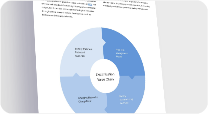 CLIMATE TRANSITION Electrification Value Chain Catalyzing decarbonization across industries will require not Goldman Sachs supports this technology innovation and only changes at the company level but also at the system development at every stage of the value chain — from level. We’ve seen firsthand this potential for system-level helping automakers access key metals and manage price change through our work activating the full life cycle of risk in production, to advising on acquisitions for emerging electrification. In the US, the transportation sector generates electric vehicle (EV) charging network operators, to financing the largest portion of greenhouse gas emissions at 29%. Not the rapid growth of next-generation battery manufacturers. only can vehicle electrification significantly reduce emissions output, but it can also encourage technological innovation through critical areas of vehicle development, such as batteries and charging networks. Battery Materials: Price Risk Redwood Management: Materials Metals Electrification Value Chain Charging Networks: Battery ChargePoint Manufacturing: Northvolt Sustainability Report 2021 Climate Transition | Accelerating Innovation 28