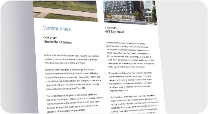 CASE STUDY: Communities 475 Bay Street CASE STUDY: Hinchliffe Stadium Goldman Sachs provided financing for the ground- up construction of 475 Bay Street, a 100% affordable development located in the Stapleton neighborhood of Staten Island, New York. The planned development is a Built in 1932, Hinchliffe Stadium was a 10,000-seat baseball 12-story residential building containing 270 units, 51% of stadium known most prominently as the home of the New which are to be set aside for formerly homeless seniors. The York Black Yankees in the 1930s and 1940s. development will include supportive services, in addition to 9,900 square feet of ground-floor retail space. Goldman Sachs provided a loan through the Passaic County Investment Authority to finance the rehabilitation The development falls within New York City’s Bay Street of Hinchliffe Stadium, an important New Jersey historic and Corridor Neighborhood Plan, which is part of Housing cultural landmark that had fallen into disrepair, as well as the New York and seeks to create a new mixed-use district new construction of 75 units of affordable senior housing that both builds and preserves affordable housing and for households earning up to 60% of AMI. provides a range of retail and services in the former manufacturing district. The rehabilitation is targeted at providing a significant benefit to the Paterson School District and broader Paterson The project was awarded a subsidy from New York State’s community by enabling Hinchliffe Stadium to once again Empire State Supportive Housing Initiative that will provide be used as a sporting event space and cultural hub for funding for rental subsidies, operating costs, and other costs residents of the surrounding geography. associated with the supportive services to be provided by Selfhelp Community Services, an 85-year-old organization that provides housing stability for seniors. Together with NYC Department of Homeless Services, Selfhelp will help tenants adjust to independent living, which includes upfront onboarding and ongoing needs assessments, organizing wellness activities, and referring to service providers. Sustainability Report 2021 Sustainability Issuance Report | Featured Investments 132