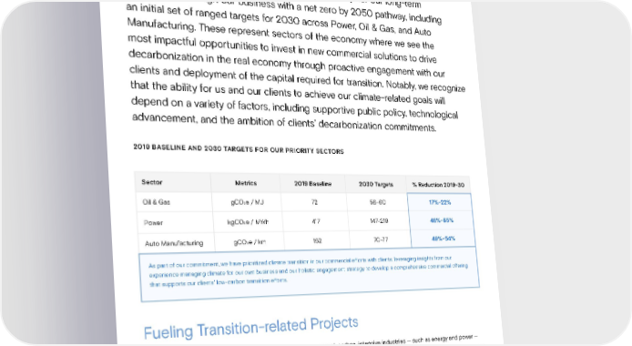 Driving Transition CLIMATE TRANSITION In our Task Force on Climate-related Financial Disclosures (TCFD) report, Accelerating Transition, we shared an interim roadmap for our long-term commitment to align our business with a net zero by 2050 pathway, including an initial set of ranged targets for 2030 across Power, Oil & Gas, and Auto Manufacturing. These represent sectors of the economy where we see the most impactful opportunities to invest in new commercial solutions to drive decarbonization in the real economy through proactive engagement with our clients and deployment of the capital required for transition. Notably, we recognize that the ability for us and our clients to achieve our climate-related goals will depend on a variety of factors, including supportive public policy, technological advancement, and the ambition of clients’ decarbonization commitments. 2019 BASELINE AND 2030 TARGETS FOR OUR PRIORITY SECTORS Sector Metrics 2019 Baseline 2030 Targets % Reduction 2019-30 Oil & Gas gCO2e / MJ 72 56-60 17%-22% Power kgCO2e / MWh 417 147-219 48%-65% Auto Manufacturing gCO2e / km 152 70-77 49%-54% As part of our commitment, we have prioritized climate transition in our commercial efforts with clients, leveraging insights from our experience managing climate for our own business and our holistic engagement strategy to develop a comprehensive commercial offering that supports our clients’ low-carbon transition efforts. Fueling Transition-related Projects In addition to public sector support and technological advancement, carbon-intensive industries — such as energy and power — will require significant capital to transition to more carbon-efficient sources. In 2021, we helped accelerate capital flows into energy transition-related projects through innovative structures, including sustainability-linked bonds (SLBs), which enable clients to raise capital in a way that is aligned with their decarbonization goals. Sustainability Report 2021 Climate Transition | Driving Transition 20