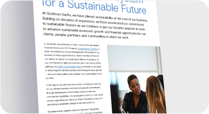 INTRODUCTION Activating the Power of the Financial System for a Sustainable Future At Goldman Sachs, we have placed sustainability at the core of our business. Building on decades of experience, we have accelerated our commitment to sustainable finance as we continue to put our broader purpose to work: to advance sustainable economic growth and financial opportunity for our clients, people, partners, and communities in which we work. In December, we published our Task Force on Climate-related Financial Disclosures (TCFD) report, Accelerating Transition, in which we shared how we are leveraging the full breadth of our business to help support the low-carbon transition efforts of our clients, as well as our roadmap to deliver on progress for our commitment to align our business with a net zero by 2050 pathway. Our 2020 Sustainability Report tracked our progress in advancing the climate transition and driving inclusive growth — the two holistic pillars that underpin our sustainability efforts as a firm. In this report, we will share how we are continuing to execute on our climate transition and inclusive growth commitments through development of innovative solutions and new commercial capabilities. As we progress toward our own goals, we are supporting our clients on their individual journeys and are driving sustainable change in the real economy. We believe that capital is critical to transform the global economy — yet its full potential is still untapped. At Goldman Sachs, we recognize it takes an interconnected, converging ecosystem of stakeholders, capital, and partnerships to mobilize capital toward sustainable outcomes. Our firm leverages our unique position at the center of global markets to catalyze vital connections at scale across the financial system, in collaboration with our stakeholders. Sustainability Report 2021 Introduction 6