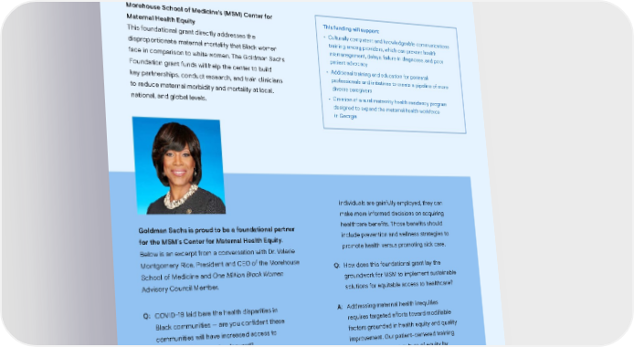 INCLUSIVE GROWTH By working with partner organizations to effect change, we’re better positioned to broaden and deepen our impact among communities close to home and across the globe. Quality Preventative Health / Having a Child Morehouse School of Medicine’s (MSM) Center for This funding will support: Maternal Health Equity • Culturally competent and knowledgeable communications This foundational grant directly addresses the training among providers, which can prevent health disproportionate maternal mortality that Black women mismanagement, delays, failure in diagnoses, and poor face in comparison to white women. The Goldman Sachs patient advocacy Foundation grant funds will help the center to build • Additional training and education for perinatal key partnerships, conduct research, and train clinicians professionals and initiatives to create a pipeline of more to reduce maternal morbidity and mortality at local, diverse caregivers national, and global levels. • Creation of a rural maternity health residency program designed to expand the maternal health workforce in Georgia individuals are gainfully employed, they can make more informed decisions on acquiring Goldman Sachs is proud to be a foundational partner healthcare benefits. Those benefits should for the MSM’s Center for Maternal Health Equity. include prevention and wellness strategies to Below is an excerpt from a conversation with Dr. Valerie promote health versus promoting sick care. Montgomery Rice, President and CEO of the Morehouse Q: How does this foundational grant lay the School of Medicine and One Million Black Women groundwork for MSM to implement sustainable Advisory Council Member. solutions for equitable access to healthcare? Q: COVID-19 laid bare the health disparities in A: Addressing maternal health inequities Black communities — are you confident these requires targeted efforts toward modifiable communities will have increased access to factors grounded in health equity and quality quality healthcare going forward? improvement. Our patient-centered training program promotes a culture of equity by A: While I remain hopeful, I am not convinced that addressing implicit bias and individual and we will not fall back into our previously held systemic racism while also utilizing quality comfort level … To avoid this, we need to ensure improvement tools and transforming culture. that there continues to be a pathway of access The foundational grant from Goldman Sachs to healthcare. For that to be sustained, one allowed MSM to develop training programs solution is to advance opportunities for more that are aligned with the organizational and Sustainability Report 2021 leadership priorities of MSM. secure employment. I am confident that when Inclusive Growth | One Million Black Women 59