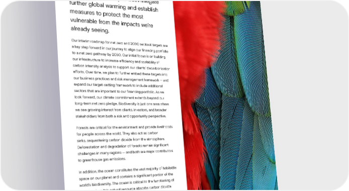 CLIMATE TRANSITION Looking Ahead: Climate Change and Biodiversity The climate challenge is complex and will require transformative change across our economy to both mitigate further global warming and establish measures to protect the most vulnerable from the impacts we’re already seeing. Our interim roadmap for net zero and 2030 sectoral targets are a key step forward in our journey to align our financing portfolio to a net zero pathway by 2050. Our initial focus is on building our infrastructure to increase efficiency and scalability of carbon intensity analysis to support our clients’ decarbonization efforts. Over time, we plan to further embed these targets into our business practices and risk management framework — and expand our target-setting framework to include additional sectors that are important to our financing portfolio. As we look forward, our climate commitment extends beyond our long-term net zero pledge. Biodiversity is just one area where we see growing interest from clients, investors, and broader stakeholders from both a risk and opportunity perspective. Forests are critical for the environment and provide livelihoods for people across the world. They also act as carbon sinks, sequestering carbon dioxide from the atmosphere. Deforestation and degradation of forests remain significant challenges in many regions — and both are major contributors to greenhouse gas emissions. In addition, the ocean constitutes the vast majority of habitable space on our planet and contains a significant portion of the world’s biodiversity. The ocean is critical to the functioning of our planet, as this natural resource absorbs carbon dioxide emissions from the atmosphere. Ocean biodiversity is also a crucial source of income for many communities around the world, and the effects of climate change on ocean biodiversity will have economic impacts around the world. Sustainability Report 2021 Climate Transition | Looking Ahead 46