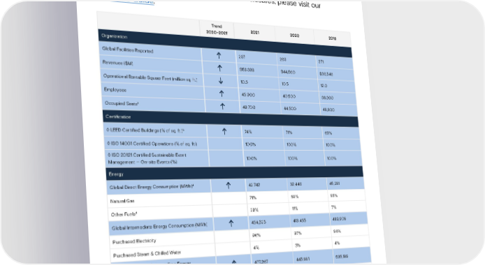 KEY METRICS & INDICATORS Environmental Indicators Below we provide an overview of selected key metrics. For a complete list of our sustainability-related resources and disclosures, please visit our Resource Guide. Trend 2021 2020 2019 2020-20211 Organization Global Facilities Reported 267 266 271 Revenues ($M) $59,339 $44,560 $36,546 Operational Rentable Square Feet (million sq. ft.) 10.3 10.5 12.0 Employees 43,900 40,500 38,300 Occupied Seats2 49,700 44,500 48,800 Certification ◊ LEED Certified Buildings (% of sq. ft.)3 74% 71% 63% ◊ ISO 14001 Certified Operations (% of sq. ft.) 100% 100% 100% ◊ ISO 20121 Certified Sustainable Event 100% 100% 100% Management — On-site Events (%) Energy Global Direct Energy Consumption (MWh)4 42,742 32,446 45,281 Natural Gas 71% 89% 93% Other Fuels4 29% 11% 7% Global Intermediate Energy Consumption (MWh) 434,525 413,435 489,908 Purchased Electricity 96% 97% 96% Purchased Steam & Chilled Water 4% 3% 4% Global Direct and Intermediate Energy 477,267 445,881 535,189 Consumption (MWh) Reduction in Global Energy Consumption from -12% -17% -1% Baseline (%) Note 1: Many metrics trending upward from 2020 to 2021 are primarily due to lifting COVID-19 restrictions and employees returning to the office. Note 2: “Occupied Seats” represents the number of people expected in the office, including both contingent workers and employees. Note 3: This symbol ◊ before an indicator denotes an environmental commitment through Goldman’s 2025 ESG and Net Zero Commitments and ongoing 2020 Operational Commitments. Net Emissions noted as zero represents achievement of the firm’s carbon neutral commitment across operations and business travel. Reductions are from a 2017 baseline, except plastics which are from a 2021 baseline or where otherwise noted. Note 4: Other fuels includes jet fuel and fuel oil. Historical data points may be adjusted to reflect new information and/or changes to protocols. SSuussttaaiinnaabbiilliittyy Re Reppoorrtt 2 2002121 KKeey My Meettrriiccs & Is & Innddiiccatatoorrs | Es nvironmental Indicators 94