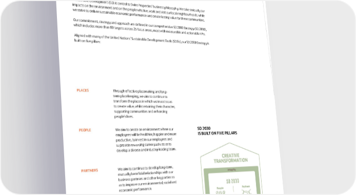 LEADERSHIP IN SUSTAINABLE DEVELOPMENT Sustainable development (SD) is central to Swire Properties’ business philosophy. We take seriously our impacts on the environment and on the people who live, work and visit our local neighbourhoods, while we strive to deliver sustainable economic performance and create lasting value for these communities. Our commitment, strategy and approach are defined in our comprehensive SD 2030 Strategy (SD 2030), which includes more than 80 targets across 25 focus areas, most with measurable and actionable KPIs. Aligned with many of the United Nations’ Sustainable Development Goals (SDGs), our SD 2030 Strategy is built on five pillars: PLACES Through effective placemaking and long- term placekeeping, we aim to continue to transform the places in which we invest so as to create value, whilst retaining their character, supporting communities and enhancing people’s lives. PEOPLE We aim to create an environment where our SD 2030 employees will be healthier, happier and more IS BUILT ON FIVE PILLARS productive, to invest in our employees and to provide rewarding career paths so as to develop a diverse and industry-leading team. PARTNERS We aim to continue to develop long-term, mutually beneficial relationships with our business partners and other key parties so as to improve our environmental, social and economic performance. Performance We aim to continue to design, construct and (Environmental) manage high quality developments that contribute positively to communities and the environment. Performance We aim to deliver sustainable (Economic) economic performance coupled with good corporate governance and high ethical standards.