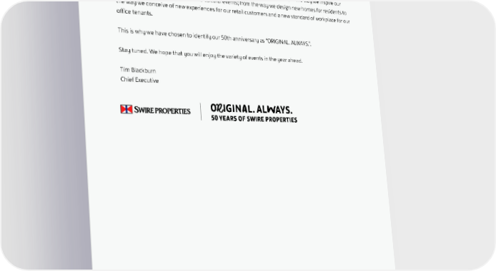 This year we are looking forward to recognising our 50th anniversary in an original way. Join us as we mark this important occasion by celebrating our values and our achievements, while looking to the future with confidence. Our celebrations will focus on originality. Originality has always set us apart. It is central to what we stand for. It speaks to our dedication to quality, good design and our commitment to the process which we refer to as Creative Transformation. It captures the essence of how we work and the variety of properties created in our name. We are original in how we approach placemaking and we are determined to create places where people can live happier and healthier lives. Our originality extends from the way we welcome guests to our hotels, to the way we inspire our communities through public art and cultural events; from the way we design new homes for residents to the way we conceive of new experiences for our retail customers and a new standard of workplace for our office tenants. This is why we have chosen to identify our 50th anniversary as “ORIGINAL. ALWAYS.”. Stay tuned. We hope that you will enjoy the variety of events in the year ahead. Tim Blackburn Chief Executive