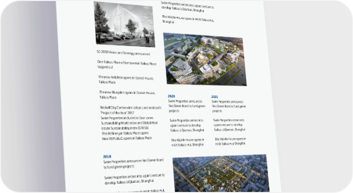 "Taikoo place is eastern hong kong’s primary business district" 2017 2019 Long-term agreement for the lease of Swire Properties announces first Green Bond the Yashow Building in Sanlitun Beijing to fund green projects to become additional space for Taikoo Li Sanlitun Swire Properties enters into a joint venture to develop Taikoo Li Qiantan, Shanghai The Middle House opens in HKRI Taikoo Hui, Shanghai SD 2030 Vision and Strategy announced One Taikoo Place office tower in Taikoo Place topped out The new ArtisTree opens in Dorset House, Taikoo Place The new Blueprint opens in Dorset House, 2020 2021 Taikoo Place Swire Properties announces Swire Properties announces Brickell City Centre wins Urban Land Institute’s first Green Bond to fund green first Green Bond to fund green ‘Project of the Year’ 2017 projects projects Swire Properties included in Dow Jones Swire Properties enters into Swire Properties enters into Sustainability World Index and Global Real a joint venture to develop a joint venture to develop Estate Sustainability Index (GRESB) Taikoo Li Qiantan, Shanghai Taikoo Li Qiantan, Shanghai The Refinery in Taikoo Place opens New REPUBLIC opens in Taikoo Place The Middle House opens in The Middle House opens in HKRI Taikoo Hui, Shanghai HKRI Taikoo Hui, Shanghai 2018 Swire Properties announces first Green Bond to fund green projects Swire Properties enters into a joint venture to develop Taikoo Li Qiantan, Shanghai The Middle House opens in HKRI Taikoo Hui, Shanghai MILESTONES